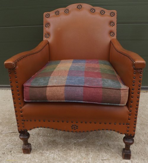 This attractive armchair dates from around the 1920s / 1930s and is very much in the art deco style. It has a tan leather finish with studwork decoration and is supported on turned bulbous oak legs at the front and swept oak legs at the back. The armchair has a shaped apron at the front and has a lovely shape overall. There are no maker's marks that we can see. It has a comfortable sprung seat and a colourful seat cushion which we believe to be a later replacement.