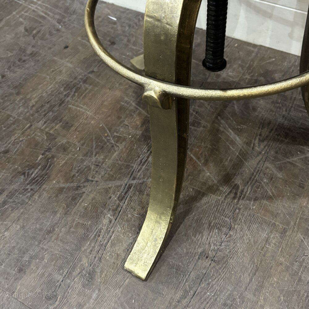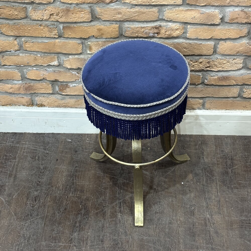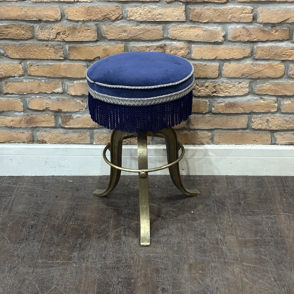 A wonderfully characterful vintage stool featuring a newly upholstered deep blue velvet seat, trimmed with silver braid and finished with a dramatic fringe skirt. The round padded top rests on a sculptural iron tripod base, painted gold to resemble aged brass. With its theatrical flair and bold colours, this piece makes a striking addition to a dressing room, boutique, or eclectic interior.