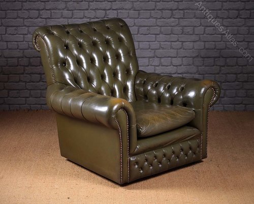 Large vintage club type leather armchair c.1970. Good size shape, with a raked backrest and roll-over arms over a deep sprung seat with loose seat cushion. Buttoned upholstery in a quality green leather attractively worn with a good patina. Excellent condition.