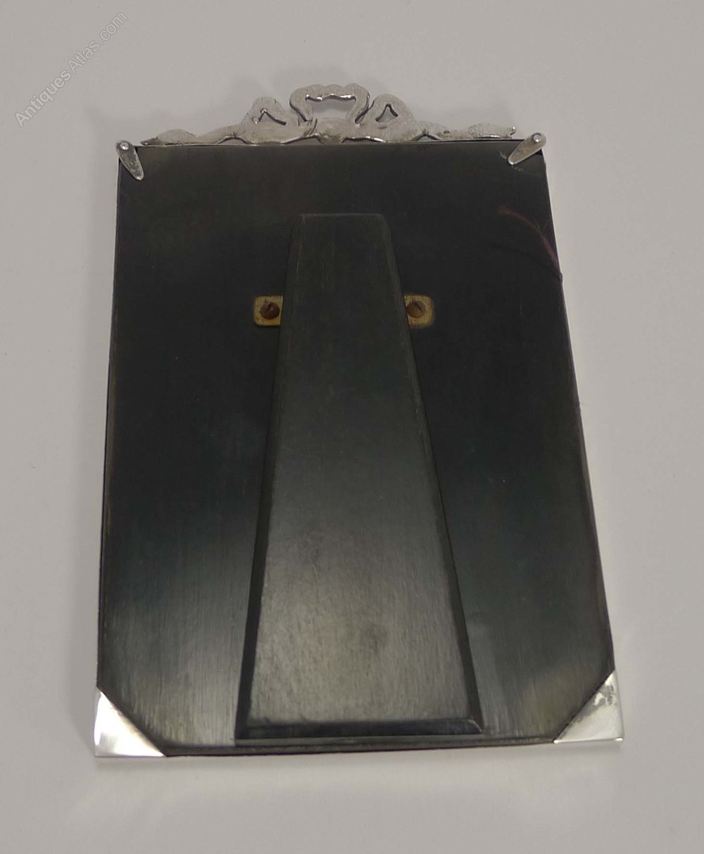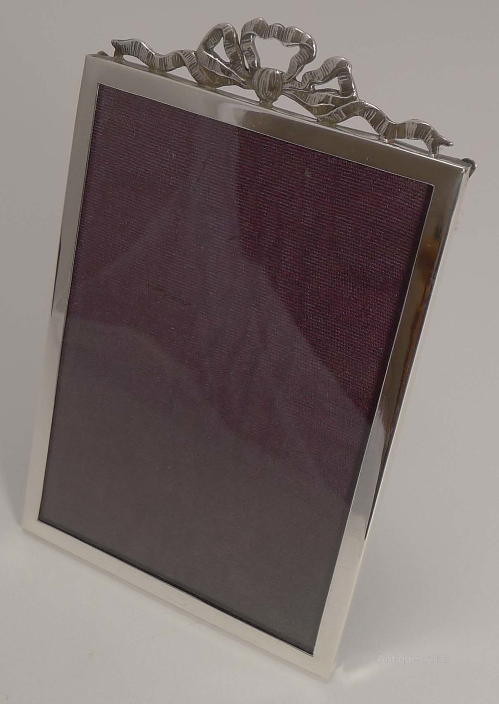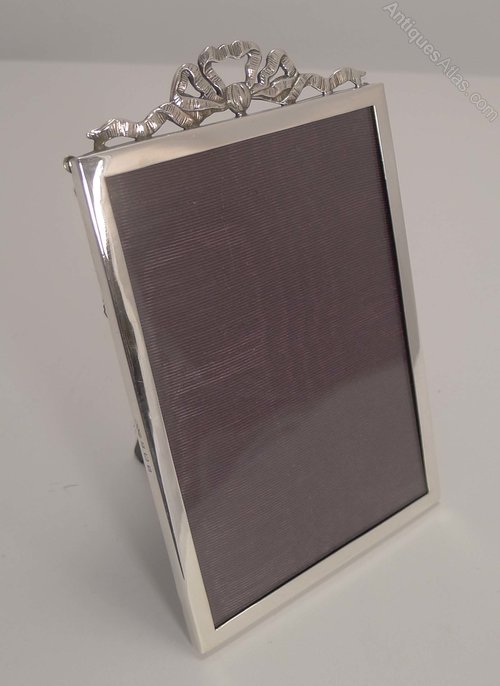 An elegant photograph frame in sterling silver topped with a pretty bow. The silver is hallmarked for Birmingham 1930, together with the makers mark for Munsey and Co.