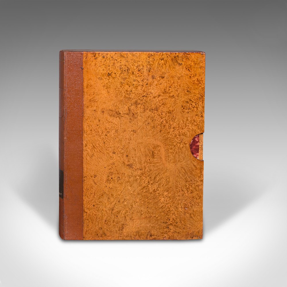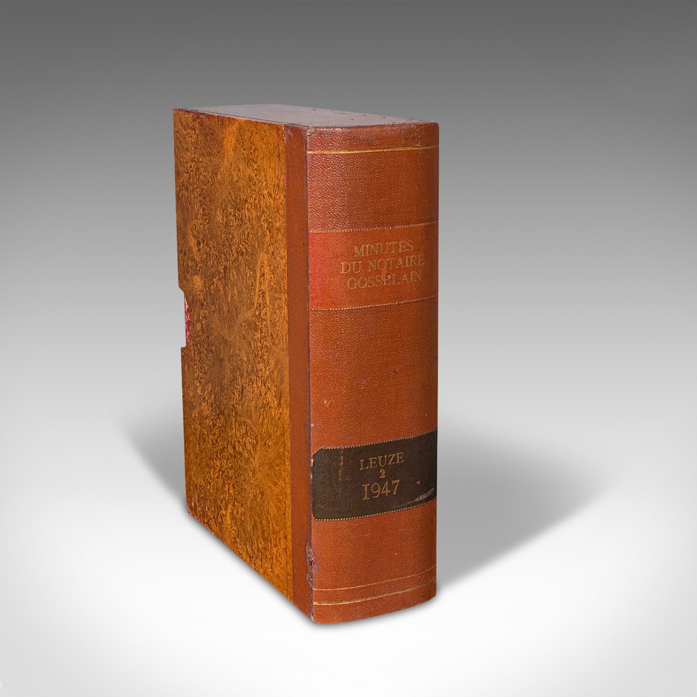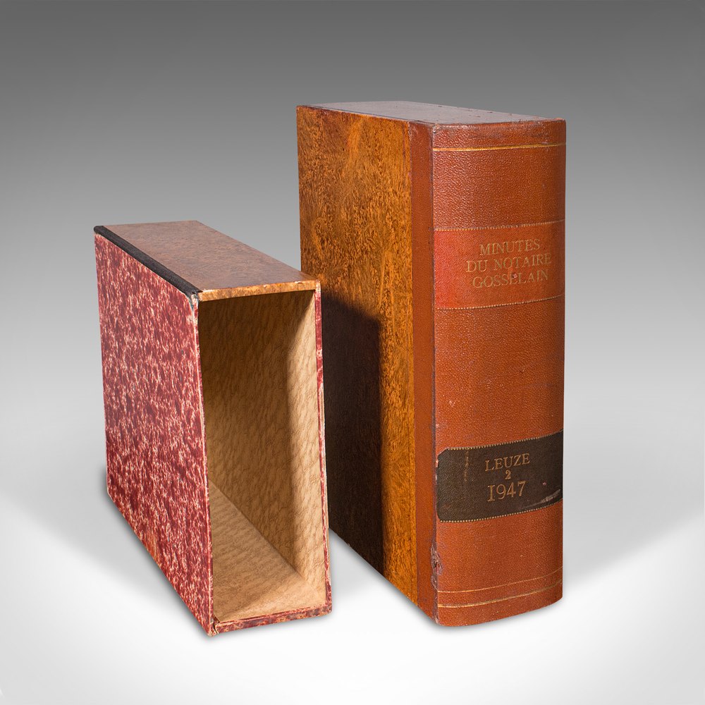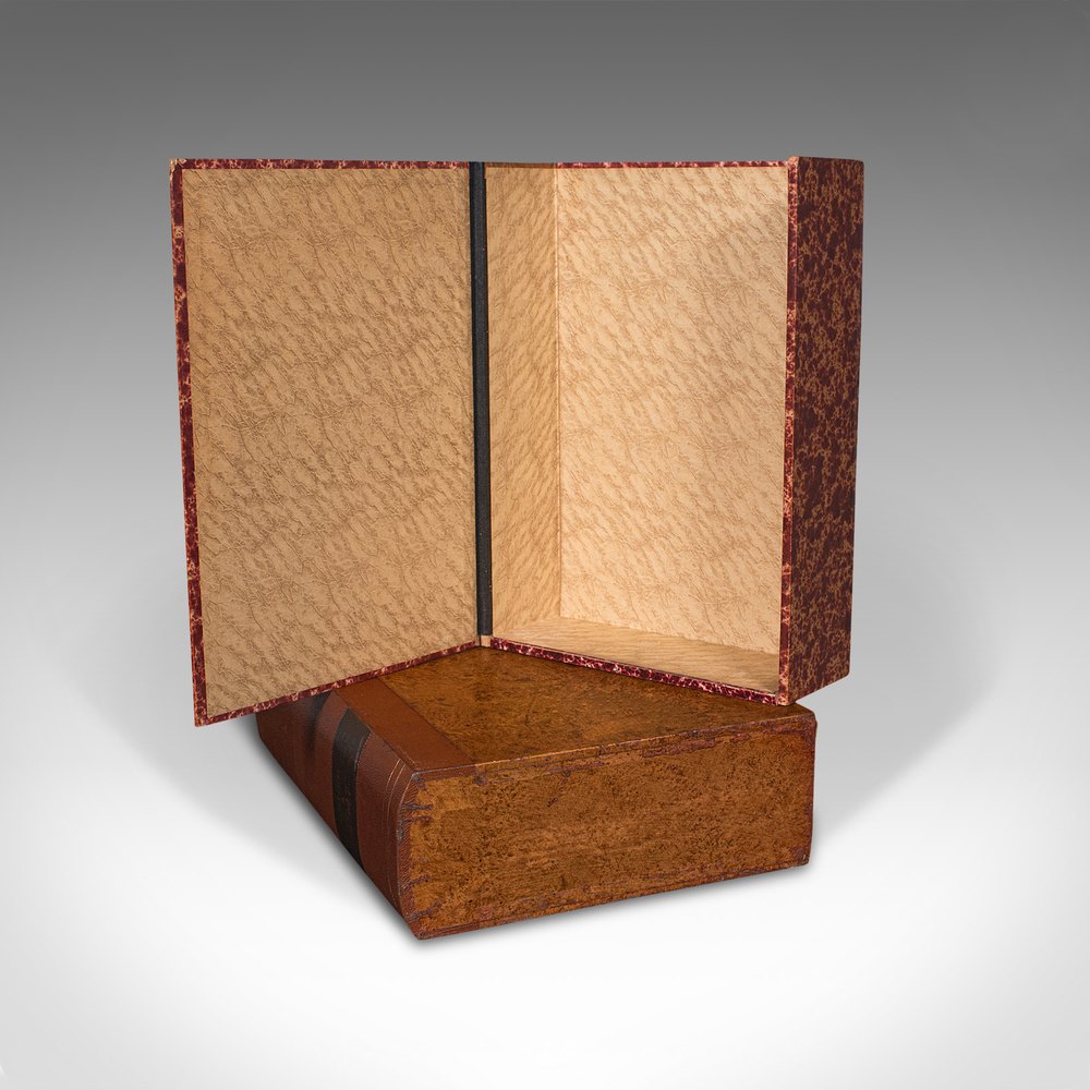 This is a vintage faux book box. An English, leather-bound folio storage sleeve or secret safe, dating to the mid 20th century, circa 1950.