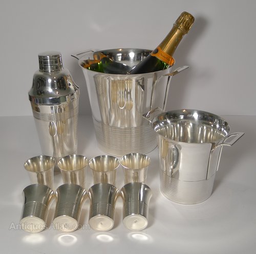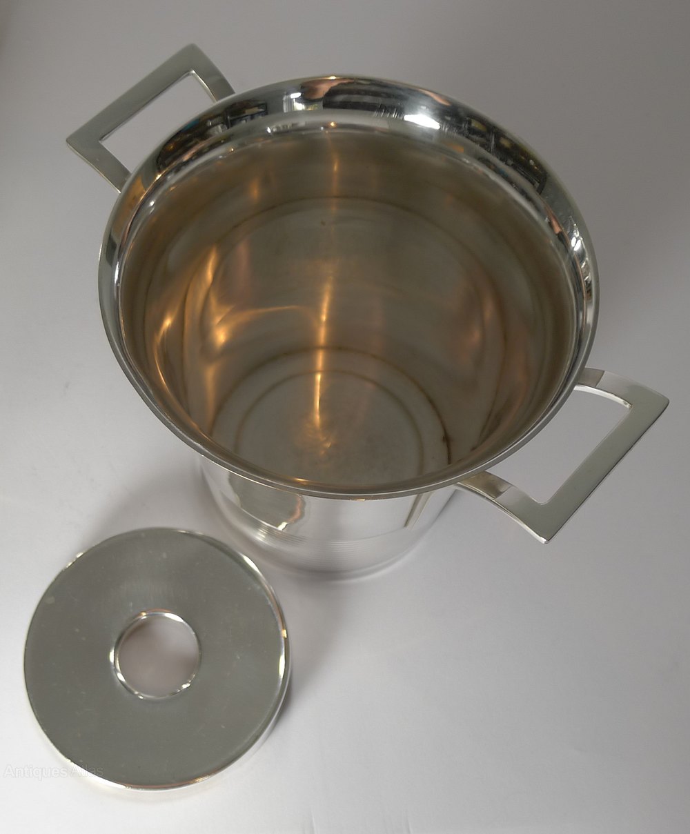 A stunning and outstanding set, Art Deco in era with a Modernist edge with the Champagne Bucket and Ice bucket with clean sleek handles.