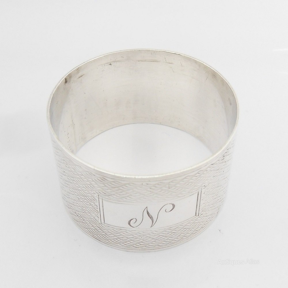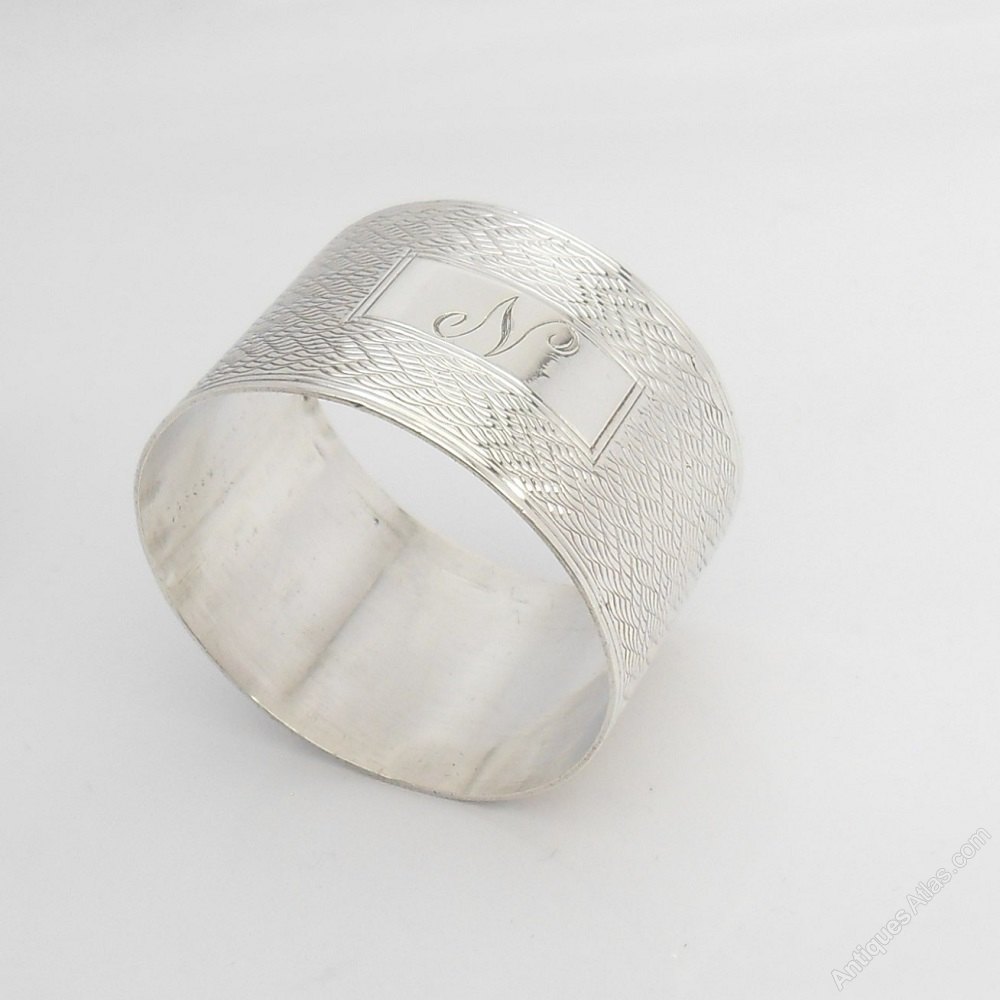 A superb heavy gauge solid silver Napkin Ring. Decorated with a stylish engine turned zig zag pattern, the Napkin Ring has an central cartouche with an initial 'N' in the centre. Hallmarks are visible to one side for Birmingham 1945, along with the Lion Passant and the silver maker's mark: H Bros.