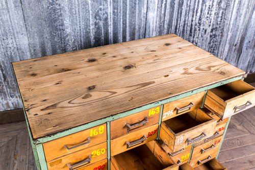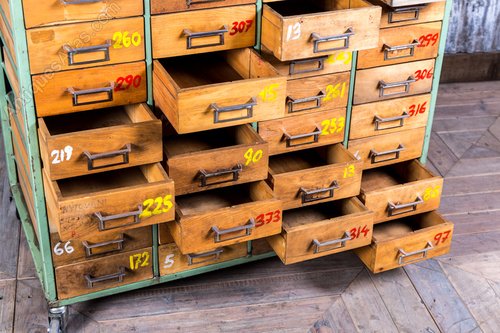 The drawer unit has a green/blue metal frame, and each of the drawers have been numbered using red, yellow and white paint.