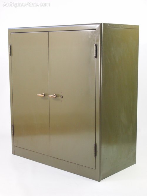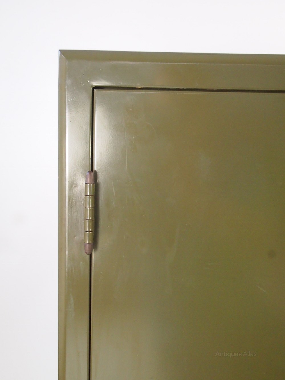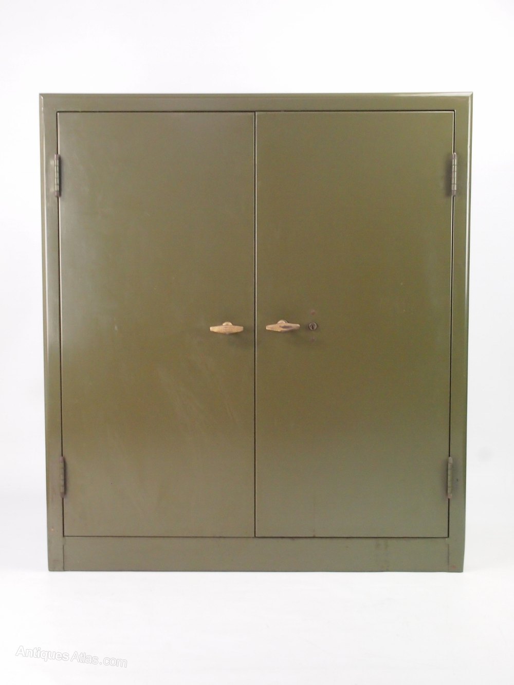 A vintage industrial metal cabinet in original pale army green painted finish dating from circa 1960s. With two doors which twist shut and two adjustable shelves to the interior, would make a great hall cupboard, bookcase or storage cabinet in a bar or shop.