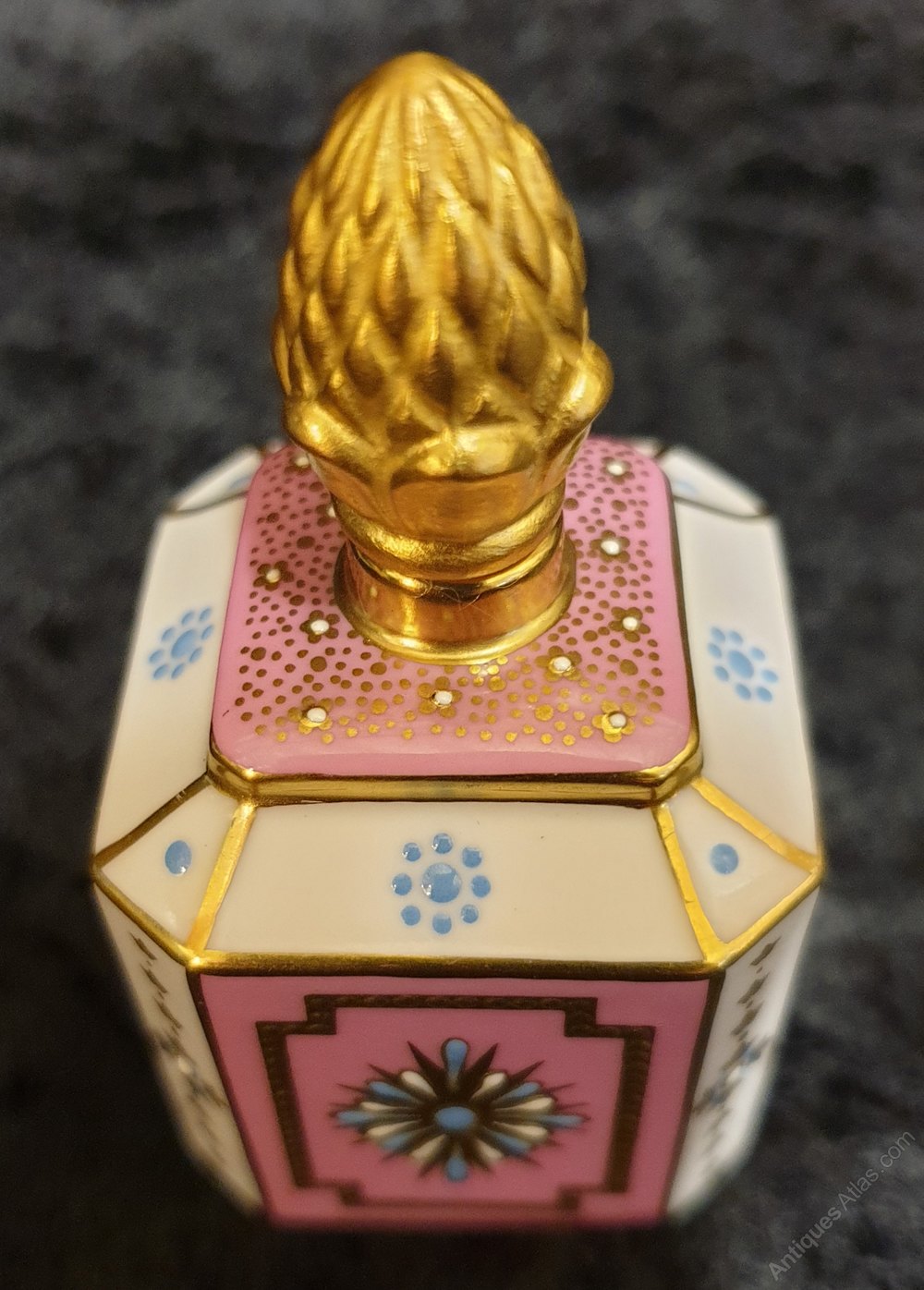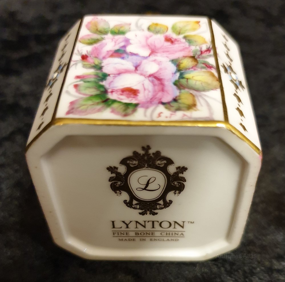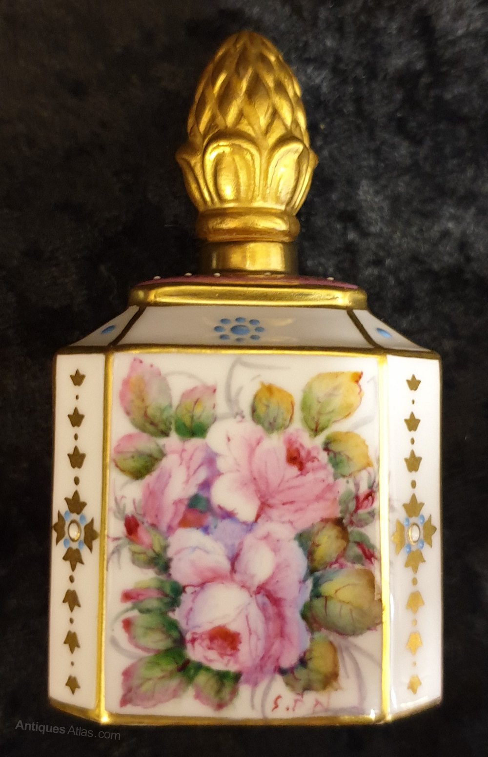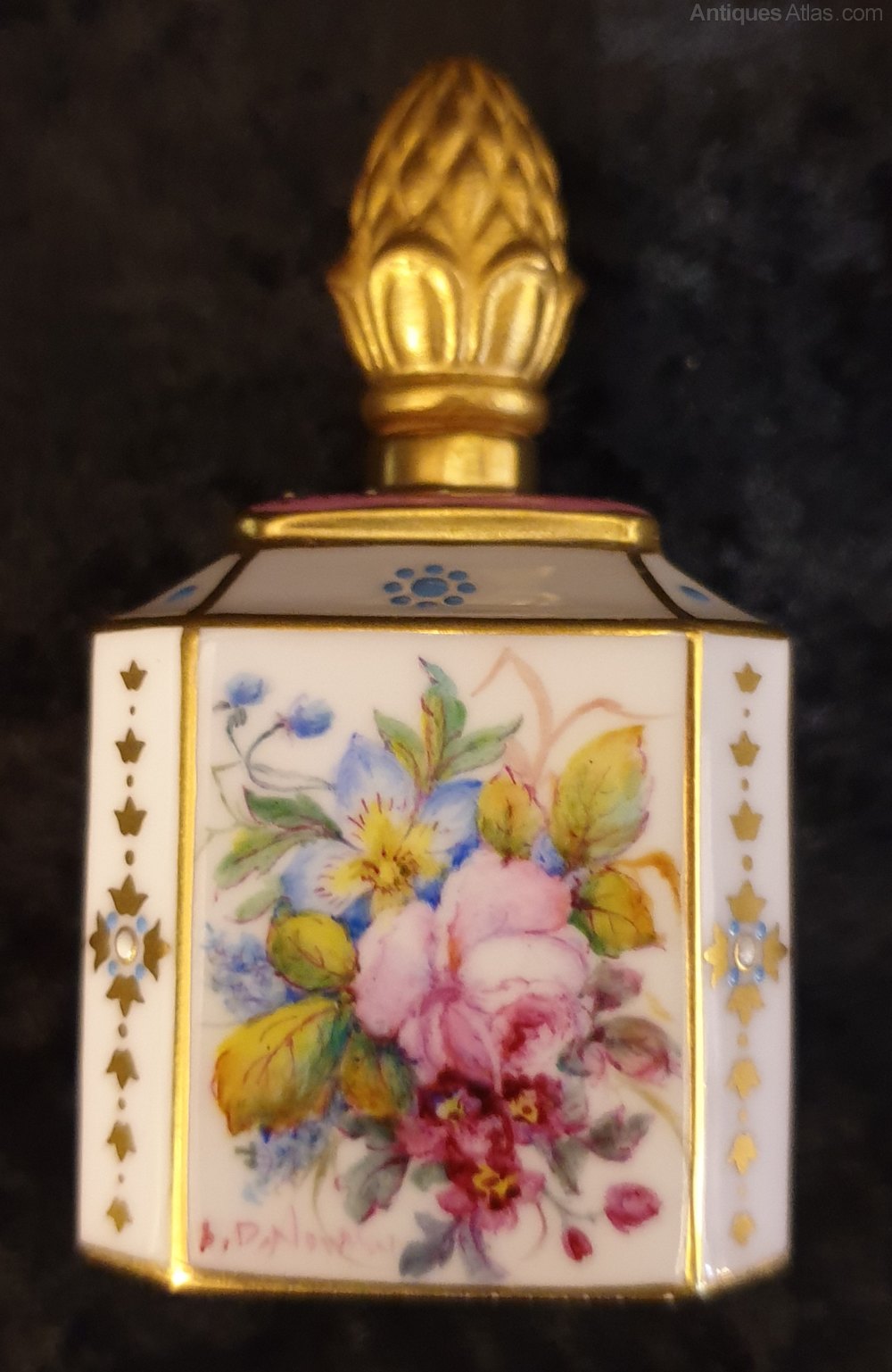 Vintage Lynton porcelain scent bottle with handpainted scene of roses by Stefan Damien Nowacki,c1980s.Stefan Nowacki was employed as a painter and gilder at the Royal Crown Derby works and in 1980 he left to establish his own company, Lynton Porcelain.In superb condition, no damage or restoration or gilt loss.Height - 7cm.Width - 3.5cm.