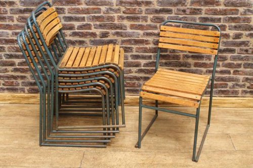 All of these vintage wooden stacking chairs are in good condition with no breaks to the steel work, but as you can appreciate, being used on a daily basis, there may be marks to the paint work, and wear and tear to the seats which we feel adds to their character.