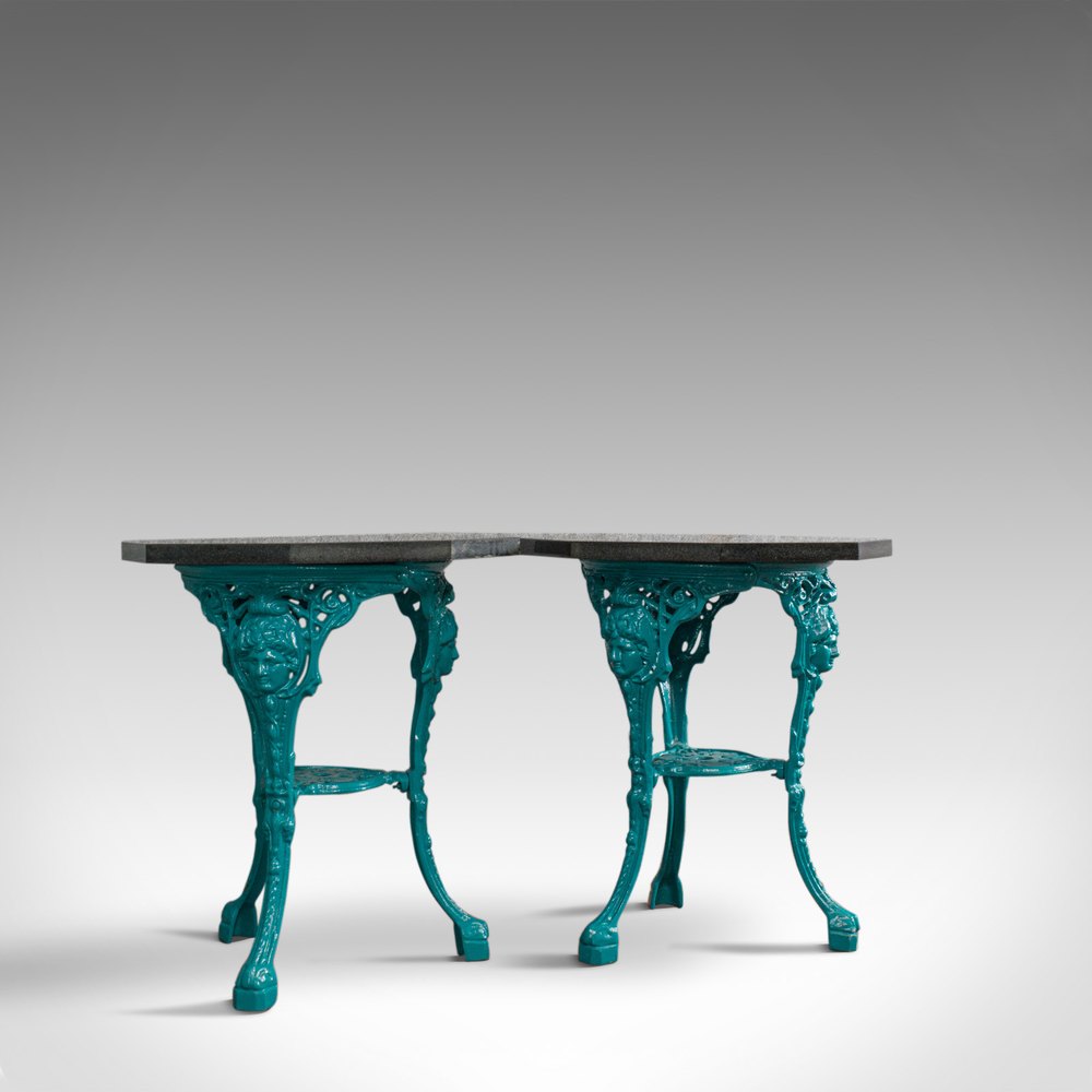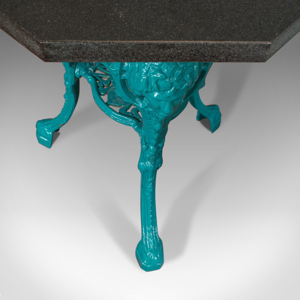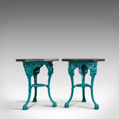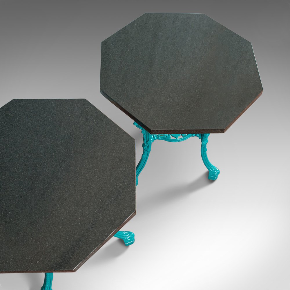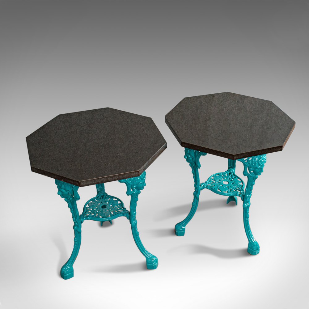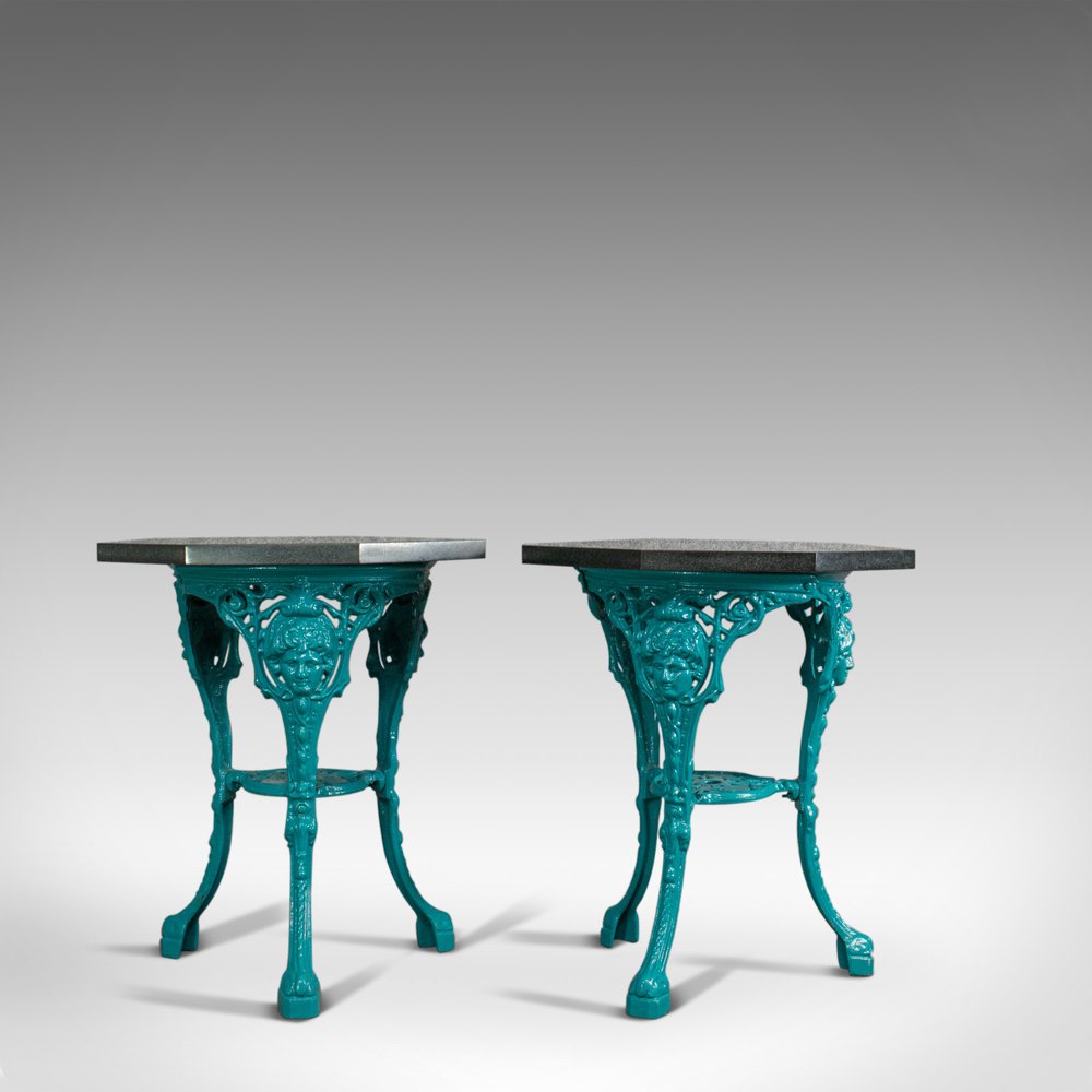 This is a vintage pair of galaxy granite topped antique tables. An English, cast iron side or lamp table by sculptural artist Dominic Hurley and dating to the 20th century.