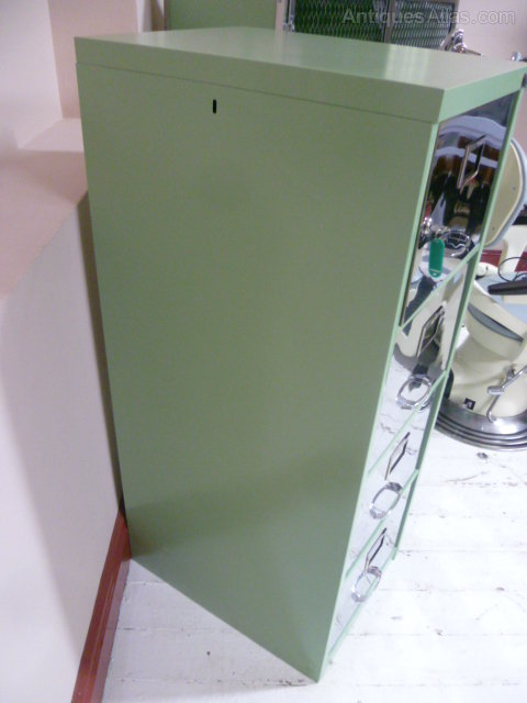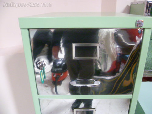 Vintage polished & painted filing cabinet / drawers with top cupboard over three pull out drawers. Unusual model!