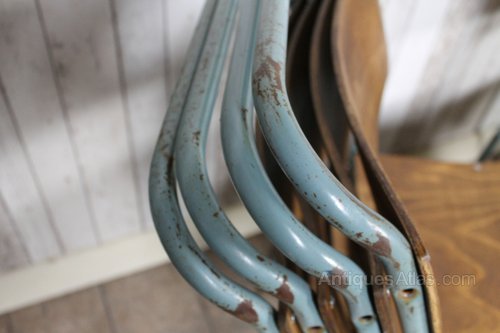 These superb and extremely sturdy original stacking chairs have gun metal frames and are fitted with curved wooden seats and back supports.