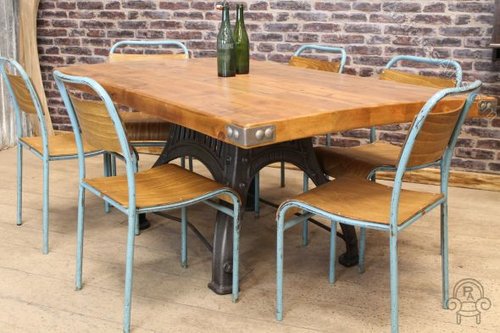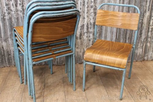 These excellent and extremely sturdy original stacking chairs have blue distressed steel frames and are fitted with curved wooden seats and back supports.