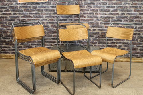 These chairs are extremely useful in any contemporary kitchen or dining room due to their stacking feature. All of these vintage wooden stacking chairs are in good condition with no breaks to the steel work, but as you can appreciate, being used on a daily basis, there may be marks to the paint work, and wear and tear to the seats which we feel adds to their character.