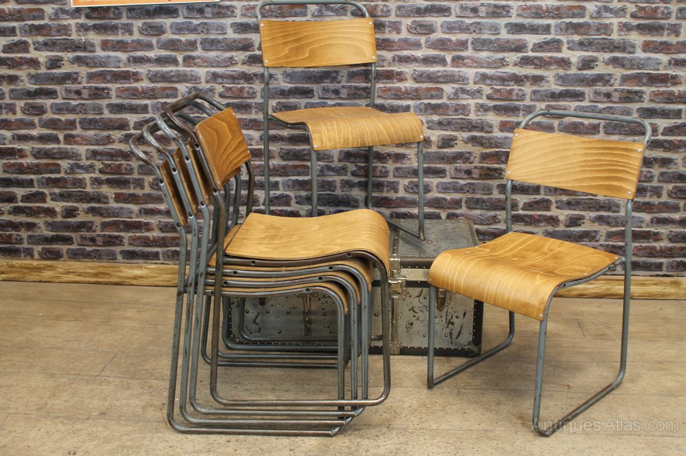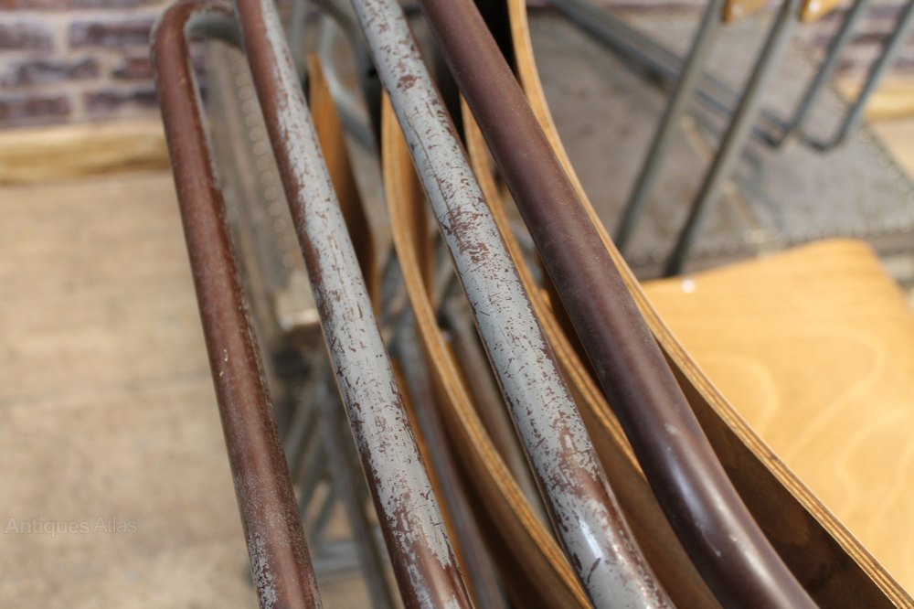 These retro plywood stacking chairs are fantastic pieces of classic and vintage industrial antique furniture. These excellent and extremely sturdy original stacking steel chairs are fitted with curved wooden seats and back supports.