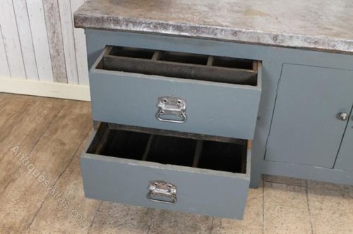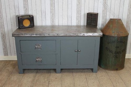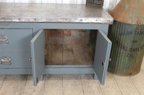Please be aware that this piece has been used on a daily basis in an industrial setting so it will show signs of general wear and tear. There is some oil staining to the inside of the drawers and the cupboard.
