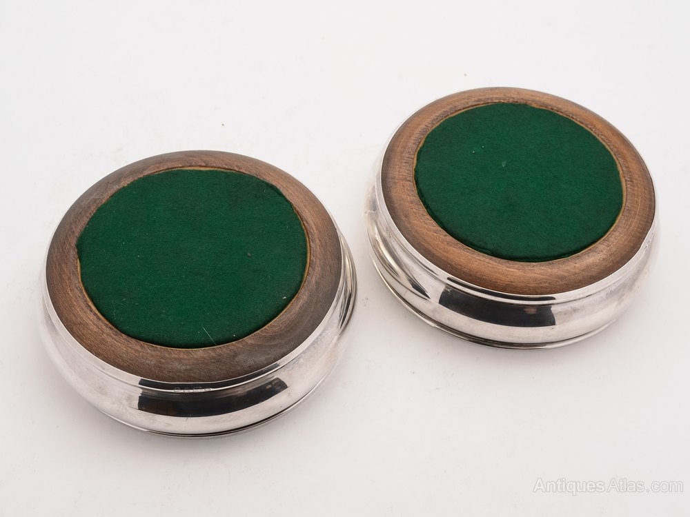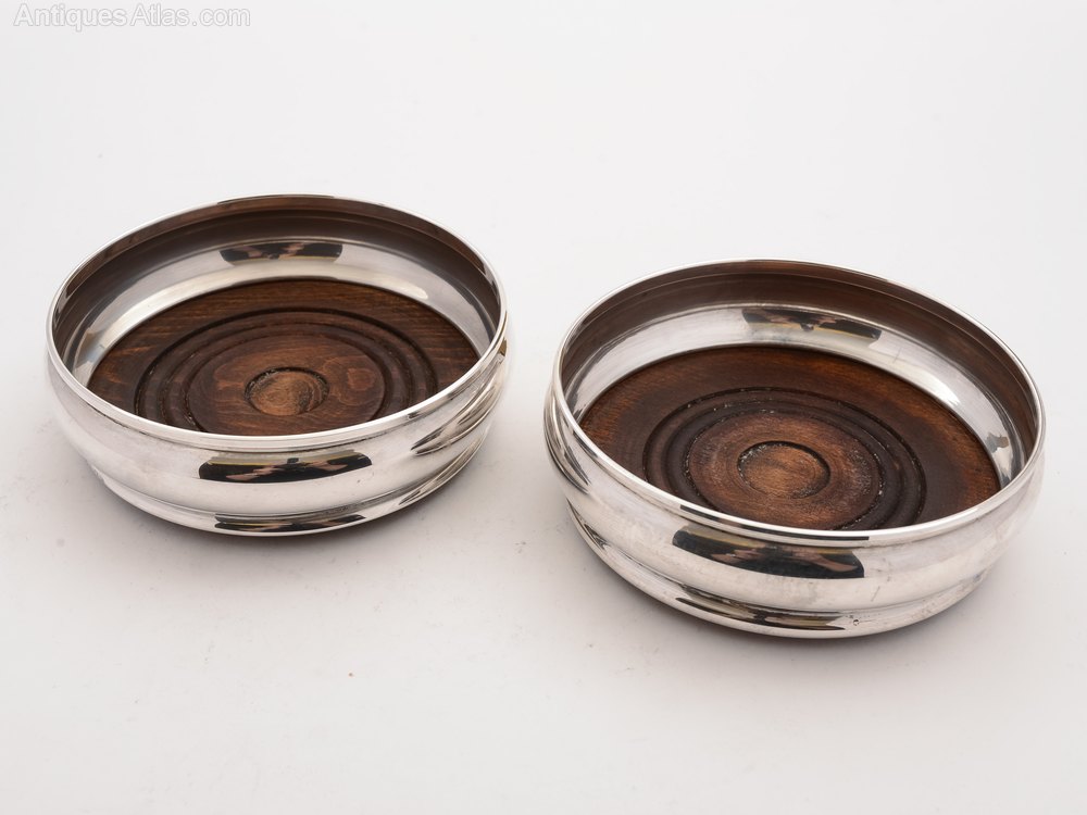 A good pair of English vintage silver coasters with plain silver sides and turned hardwood bases. Hallmarked London 1972.