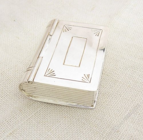 A delightful and very unusual solid silver pill box in the form of a book. The hinged lid opens to reveal a gilt interior, along with the clear hallmarks for Birmingham 1989, Lion Passant indicating the finest sterling silver and the maker's mark: Hampton Utilities. Ideal to carry on one's pocket.