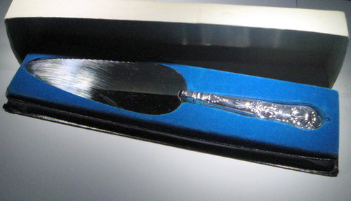 Vintage silver handled Queens Pattern cake slice or pie server in original box.