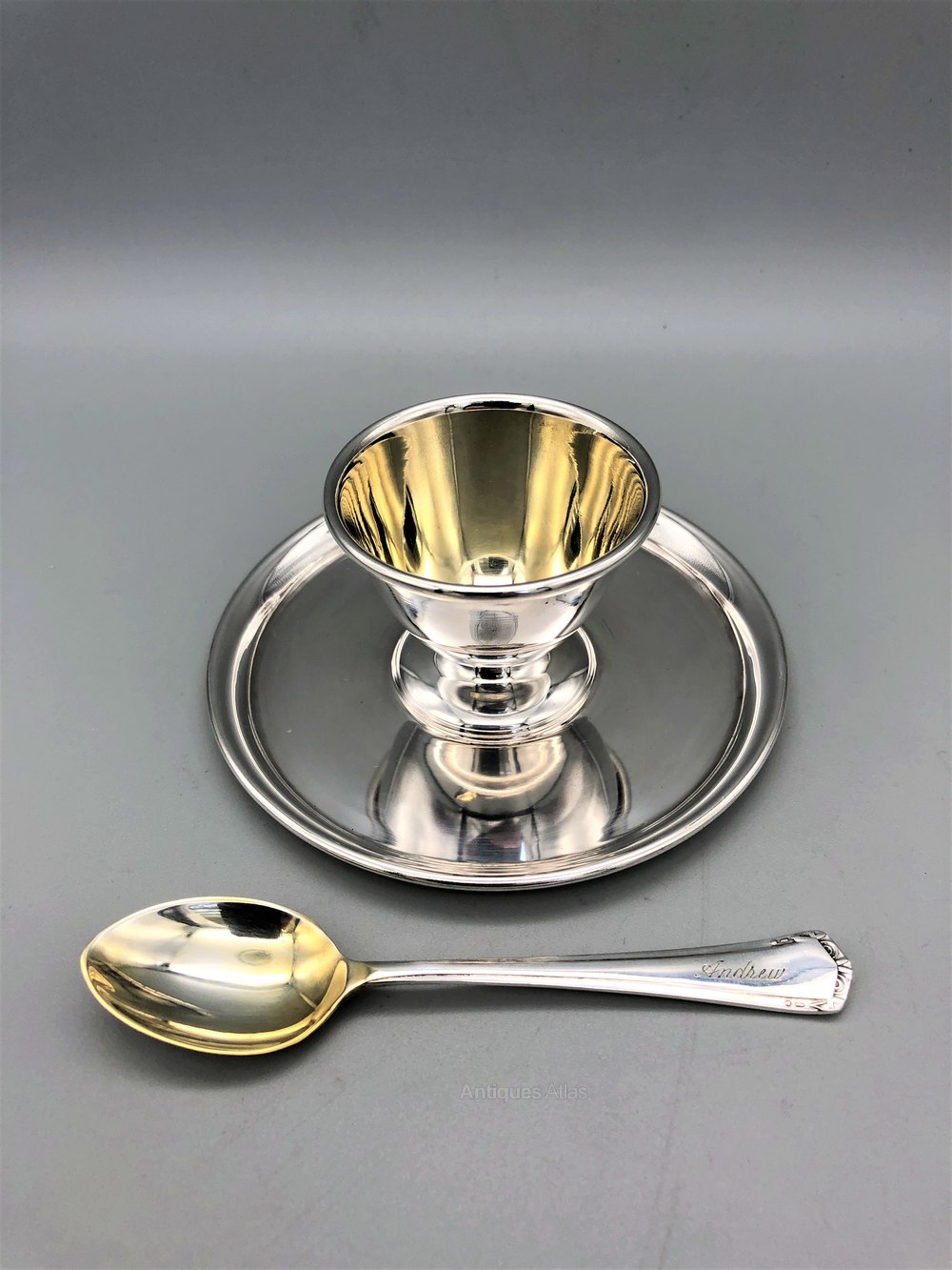 This is a very smart cased Vintage Silver Plated Egg Cup & Spoon Set. The interior of the egg cup and the bowl of the spoon are both gilded and the spoon has the name Andrew neatly engraved at the top of the stem. The box is faux snakeskin with a satin lining to the lid and velvet tray for the egg cup.