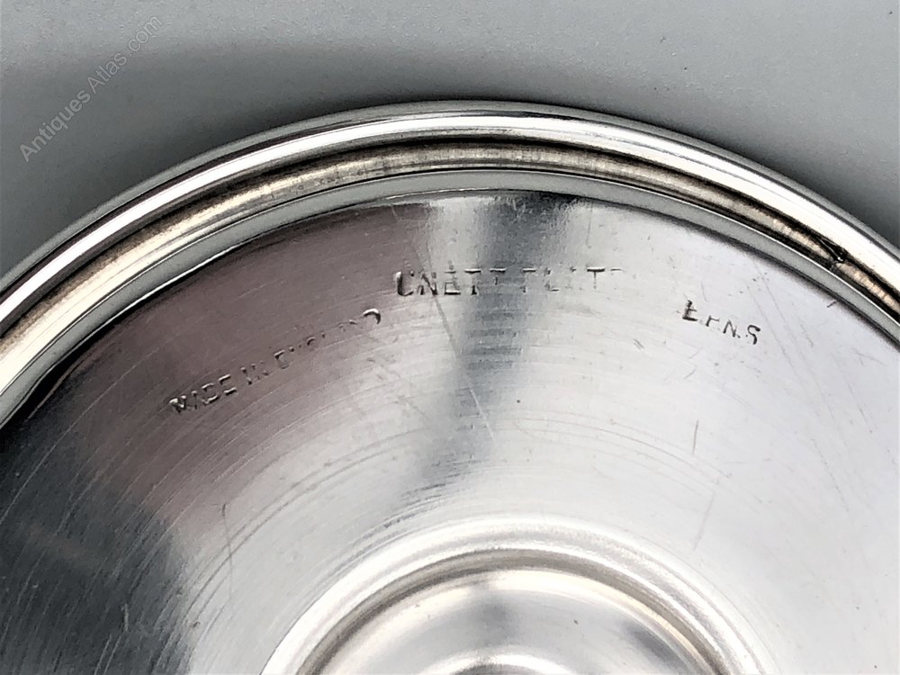 The underside of the egg cup saucer is marked UNETT PLATE, Made In England and EPNS for silver plate.
