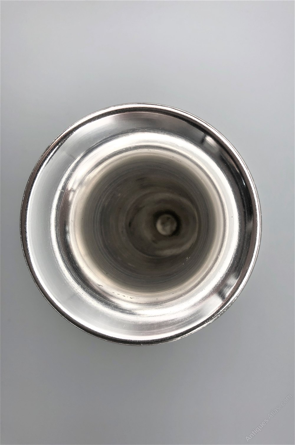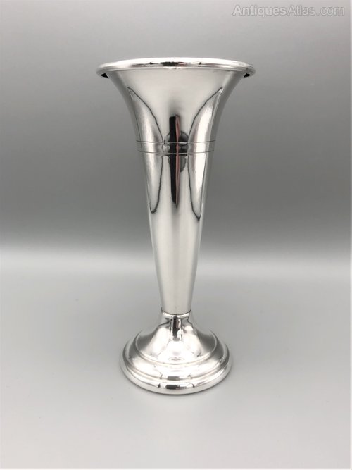This is a Vintage Silver Plated Spill Vase in the classic trumpet shape on a pedestal base with line decoration.