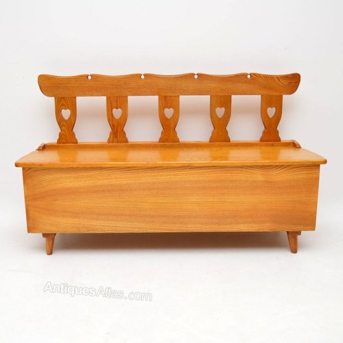 A beautifully made and very useful vintage storage bench, this was made in Switzerland and dates from around the 1950’s. It is extremely well made from solid elm,, the seat lifts up to reveal the storage space. We have had this stripped and re-polished to a very high standard, the condition is excellent throughout. We also have the matching pair of side chairs that came with this available separately, seen listed under our other items for sale.
