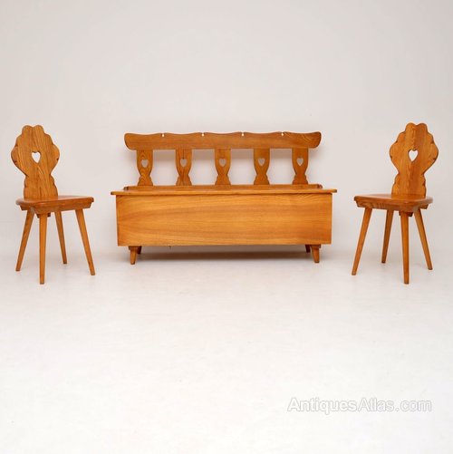 A very unusual and extremely well made entry suite, this consists of a solid elm pair of side chairs and a solid elm bench with a lift up seat for storage. It was designed as entry antique furniture but it’s versatile and can be used in a number of settings. These are extremely well made, we have had them all completely stripped and re-polished to a very high standard, the condition is superb throughout. The elm has a gorgeous colour and striking grain patterns, the quality of construction throughout is really so high.