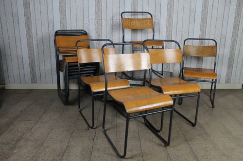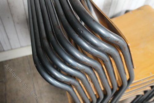 These superb and extremely sturdy original stacking chairs have gun metal frames and are fitted with curved wooden seats and back supports.
