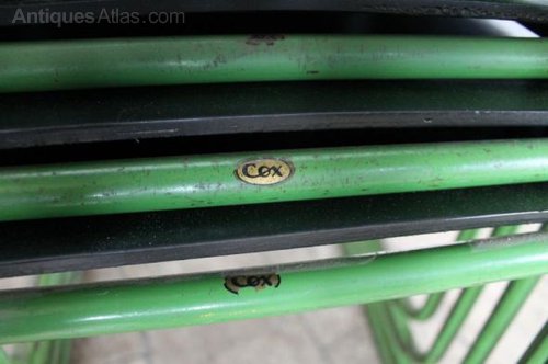These vintage Cox chairs are extremely sturdy and feature a classic tubular design with a green frame.