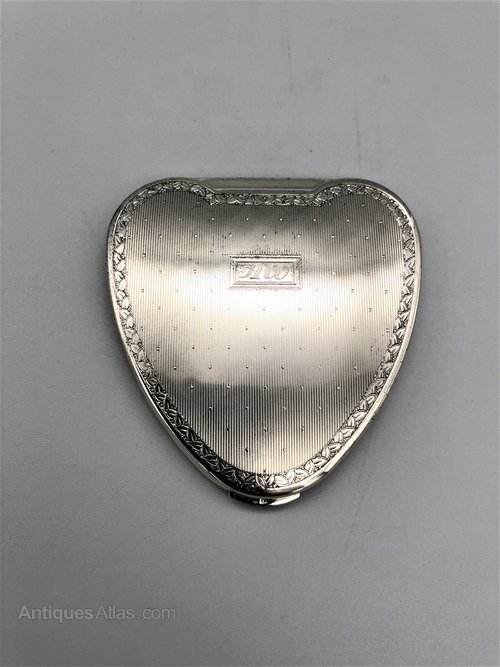 Here we have a rare, fine quality and elegant Vintage Sterling Silver Heart Shaped Powder Compact & Mirror. The compact has engine turned decoration to front and back, with the front also having a foliate border and a cartouche bearing the initials A W. There is a slight gold wash on the inside of the compact, with the mirror set in the lid and an inner lid covering the powder and puff.