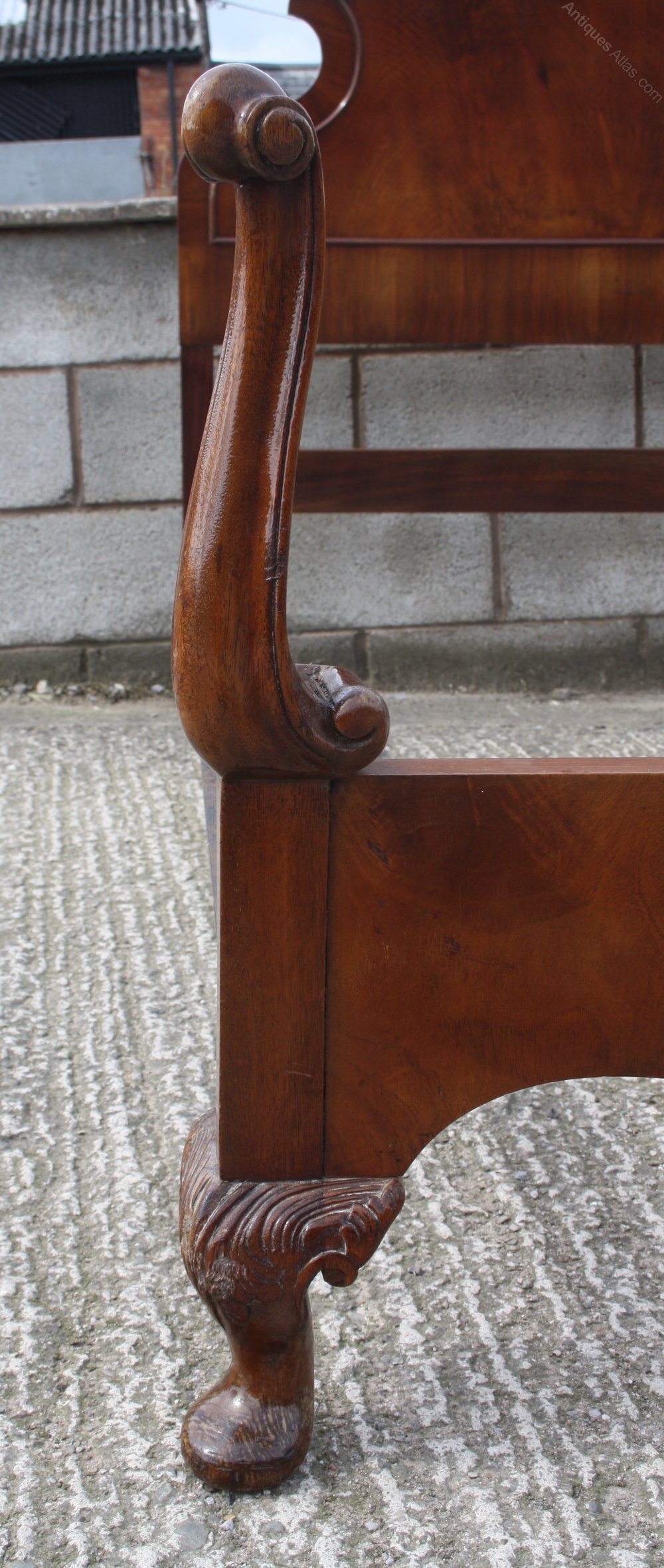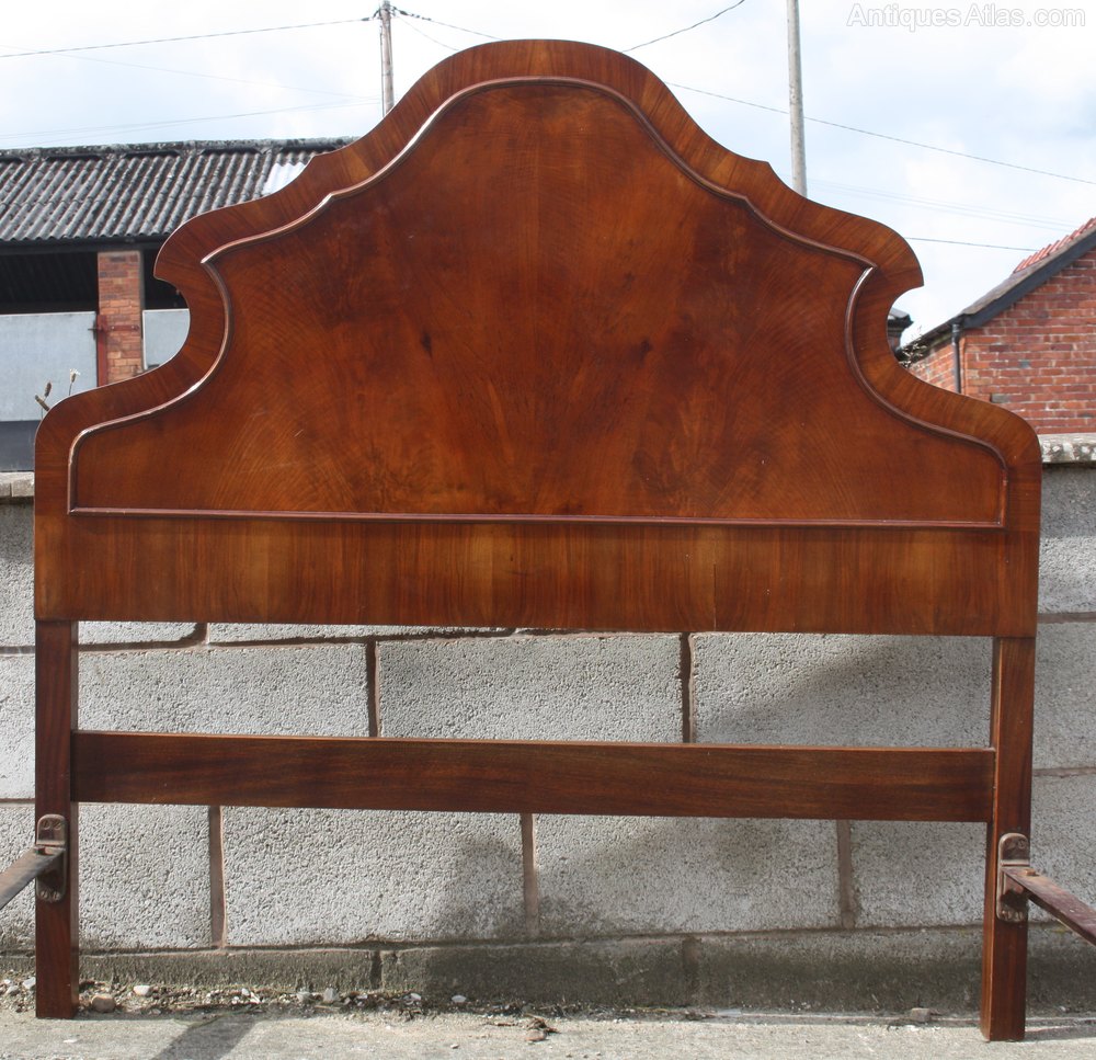 This is a magnificent standard double bed. It dates to the 1930s - 1950s and the quality is just wonderful. Look at the carved cabriole legs. Look at the shape of the 'horns'. Look at the richness of the burr walnut. The bed is in the Queen Anne style of the day and it was made to impress. It is very opulent looking.