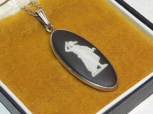 Fabulous! This classic fully hallmarked and signed JW Jasperware Silver Pendant Necklace in an original signed Wedgwood box is a delight - wonderful dark black colour, it is very nice and will delight the most discerning of buyers. The pendant is fully hallmarked with the Lion Passant, London Leopards Head and date letter A , makers mark JW for Wedgwood. All set to an 16" inch chain, it is a classic piece of fine antique jewellery that will make a beautiful timeless gift.