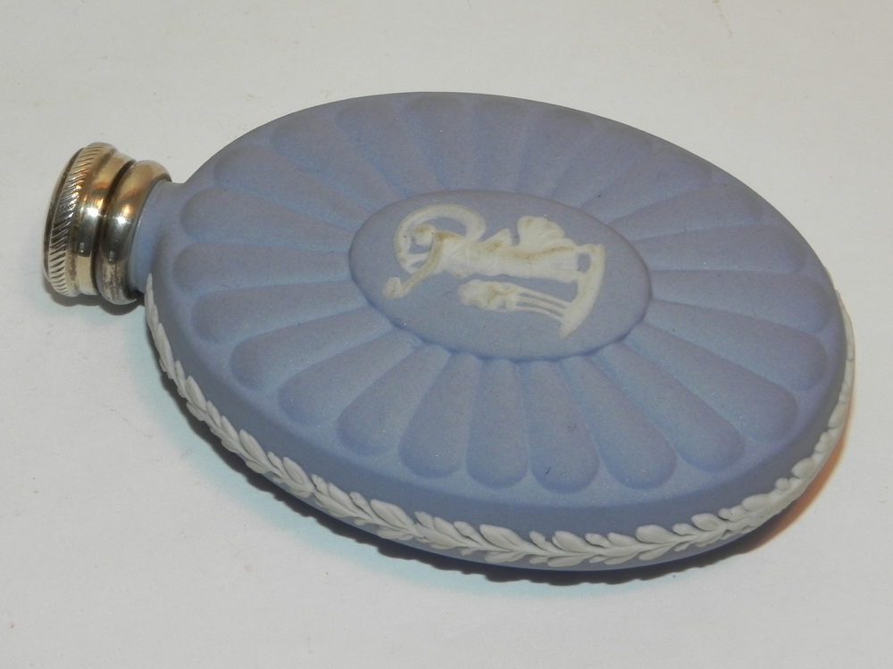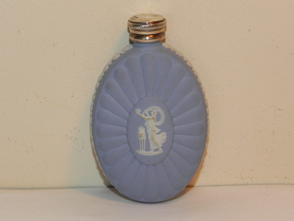 Wonderful, traditional Jasperware Wedgwood Scent Flask - fully hallmarked for JW Birmingham with the letter U to the silver screw top - depicting the picture of Pandora to the front, it is in lovely order - reproduction by Wedgwood of the original 18th Century pieces - Most unusual and very attractive piece- No chips or cracks are evident - this is a fabulous example in wonderful order . Fine collectable bottle that will certainly not disappoint!.. Don't miss this little beauty