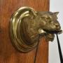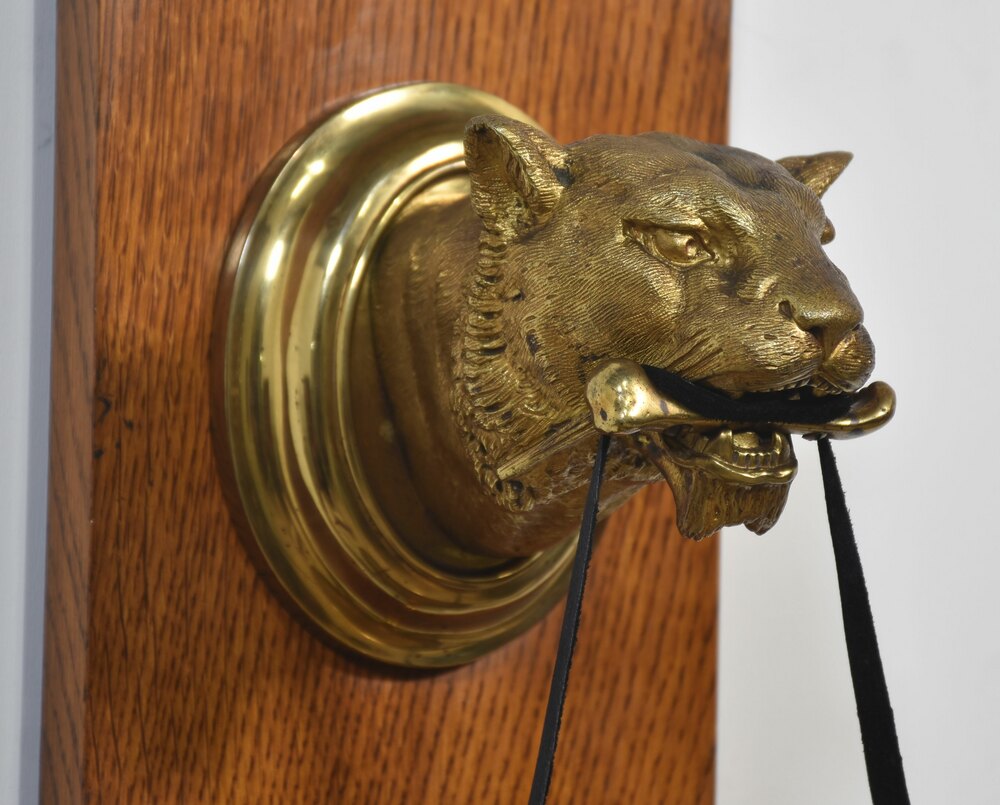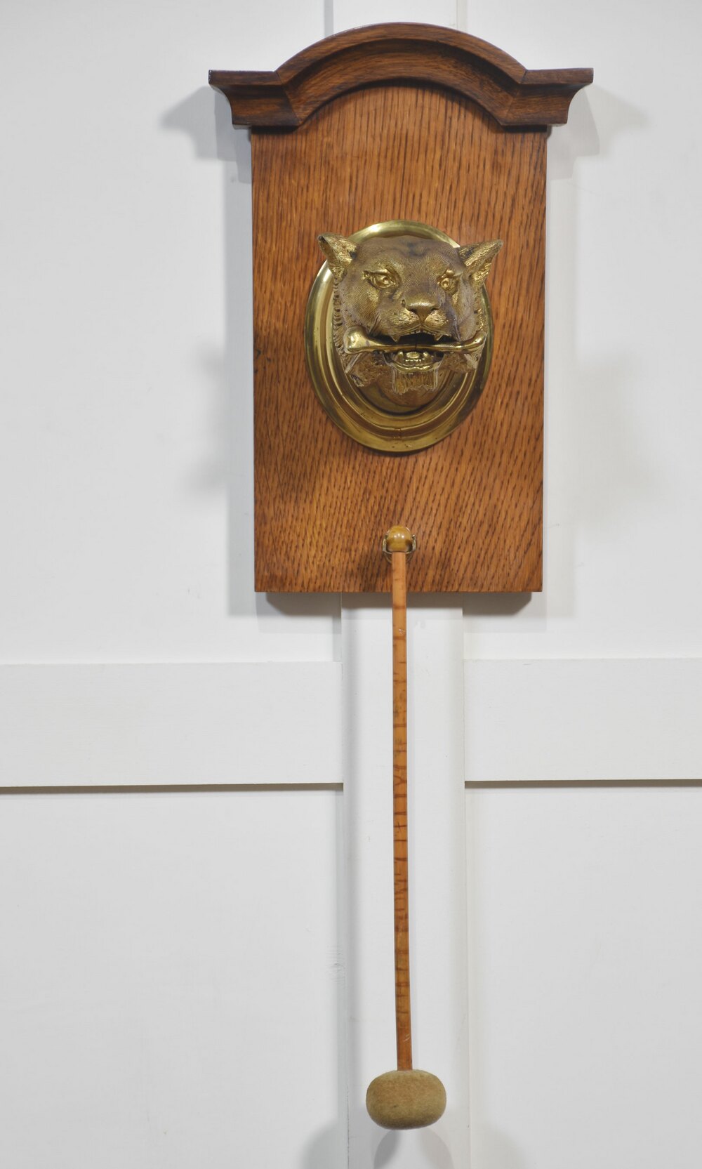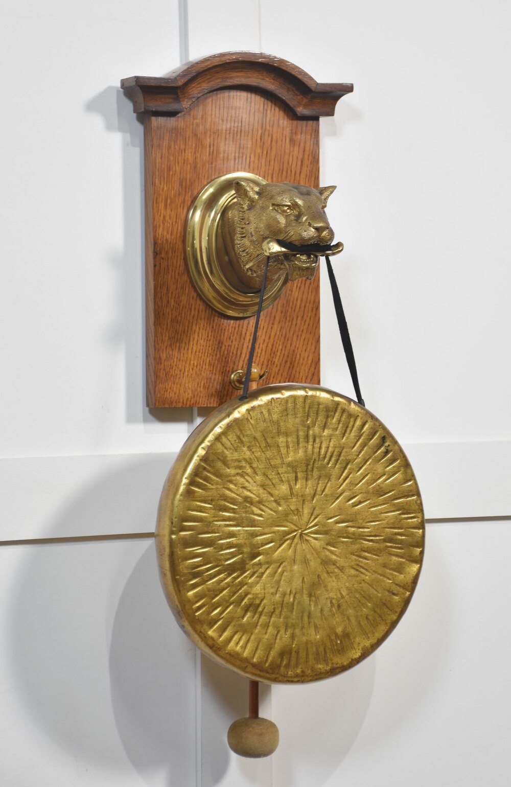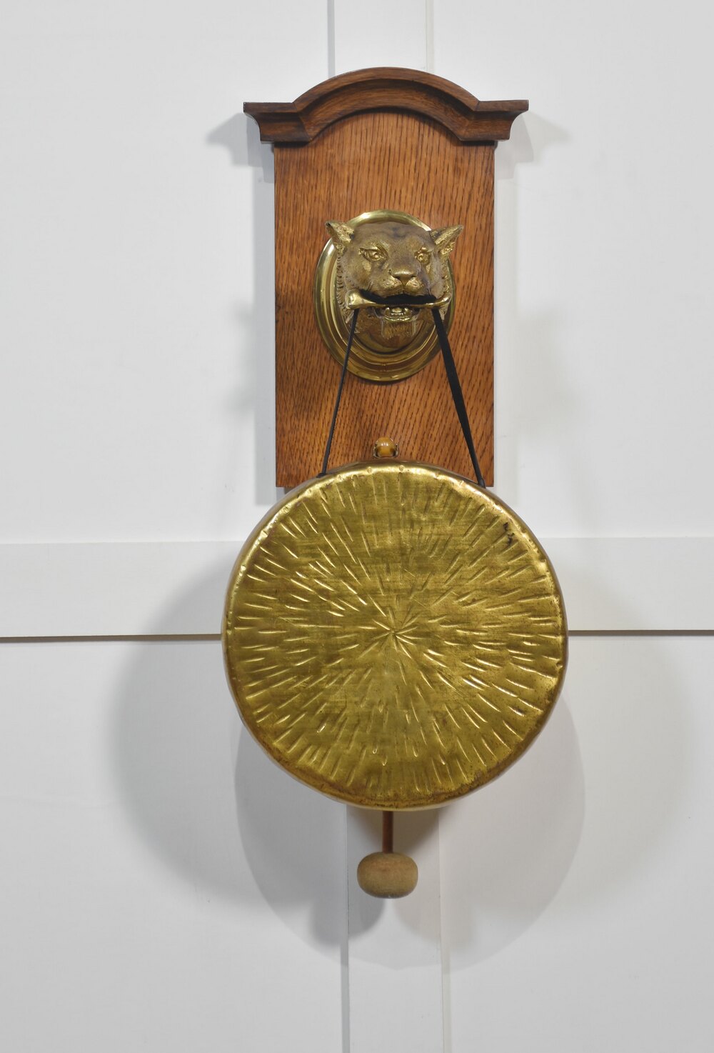 wall hanging dinner gong, the arched oak back having a gilt bronze panther head with bone in mouth on gilt oval back, complete with circular gong and original beater.