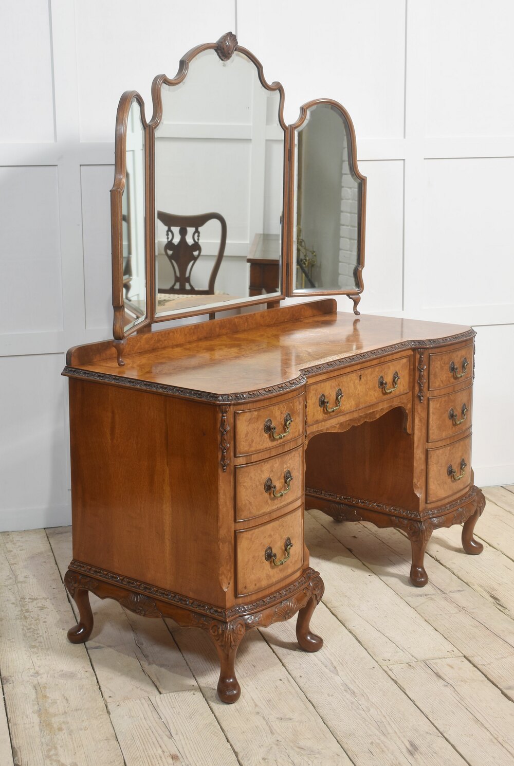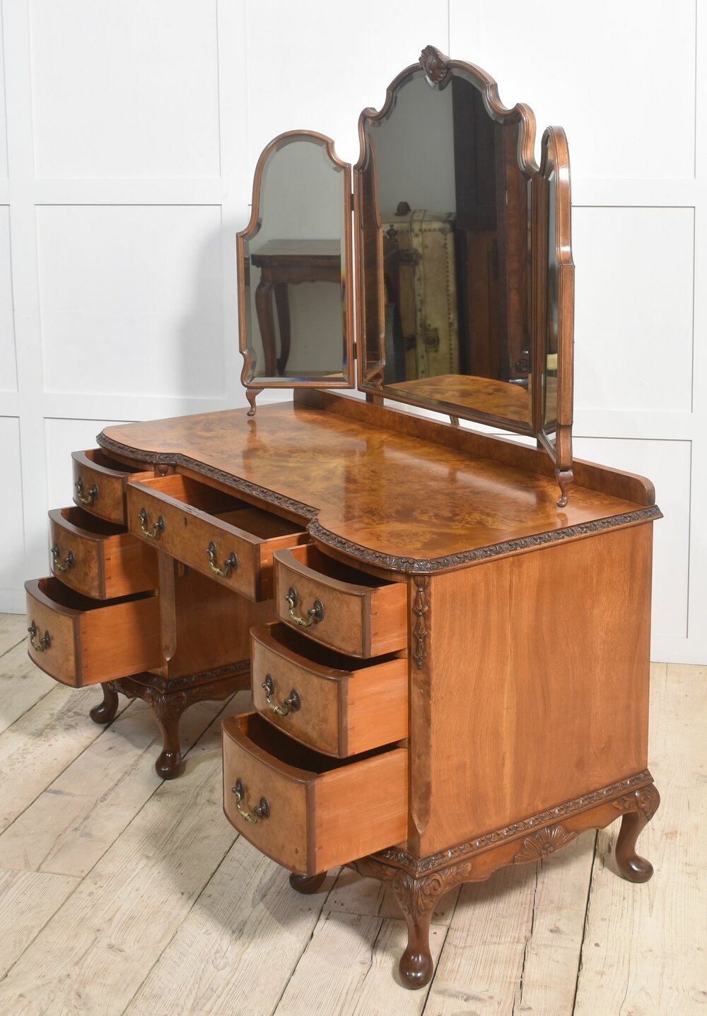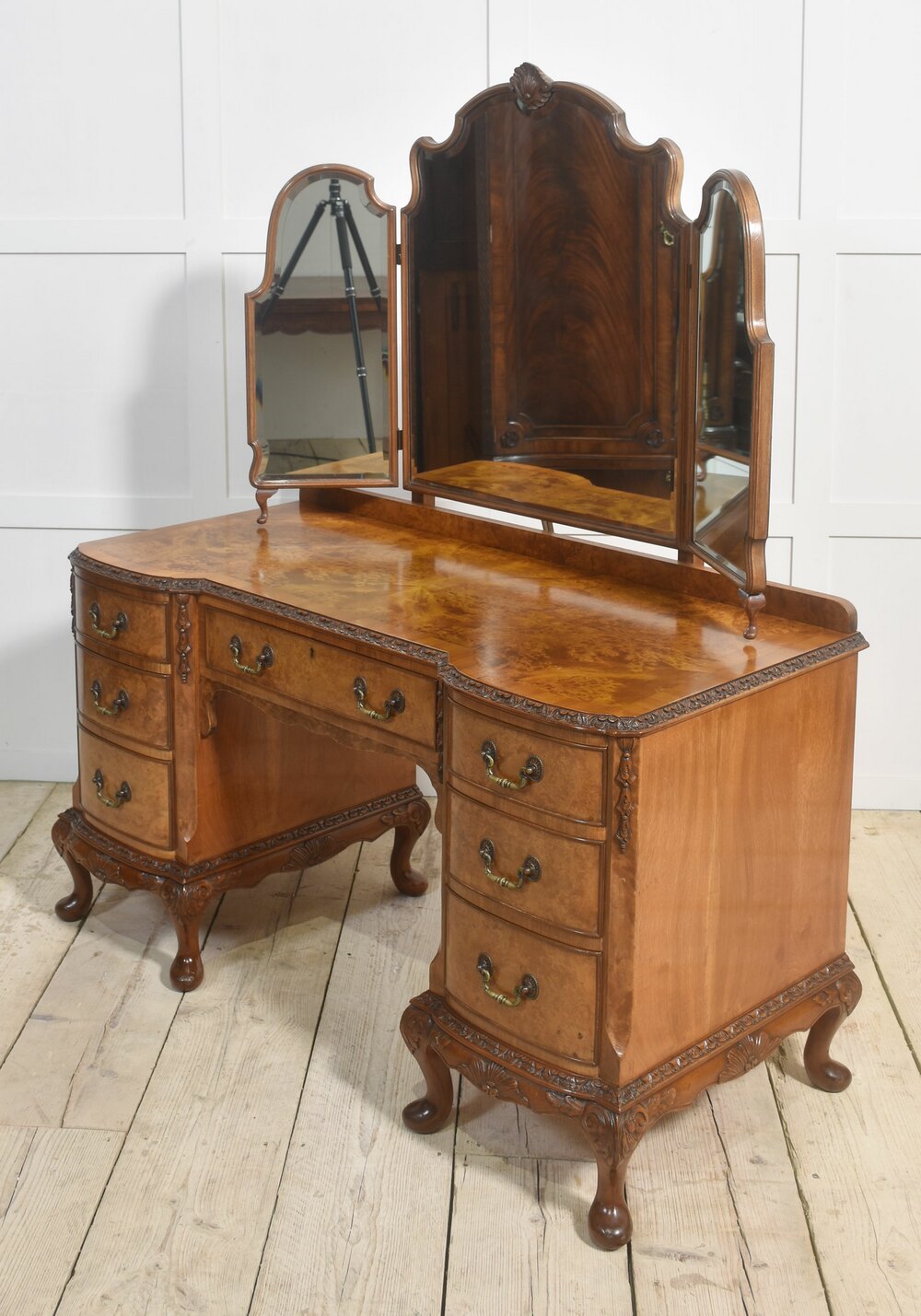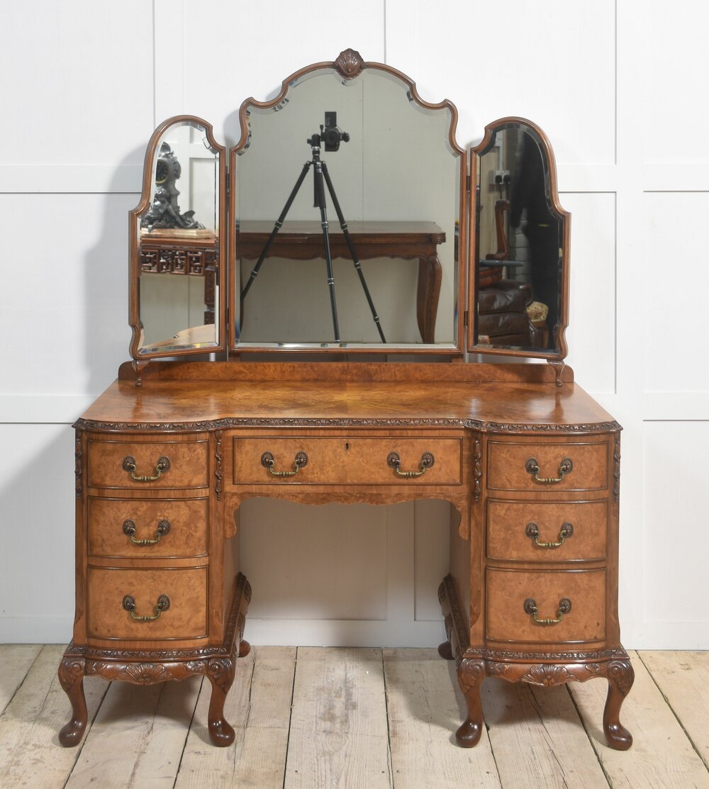 Walnut dressing table, the impressive superstructure consisting of large central arched bevelled mirror and smaller mirrors to either side having shorts gallery below. The large well figured walnut top with moulded edge, over an arrangement of drawers, having tooled handles. All raised up on short cabriole legs.