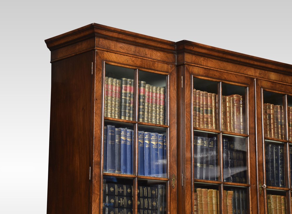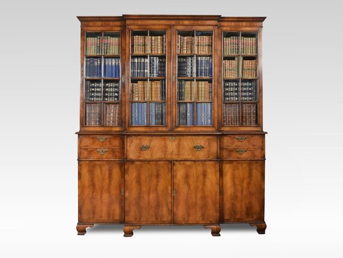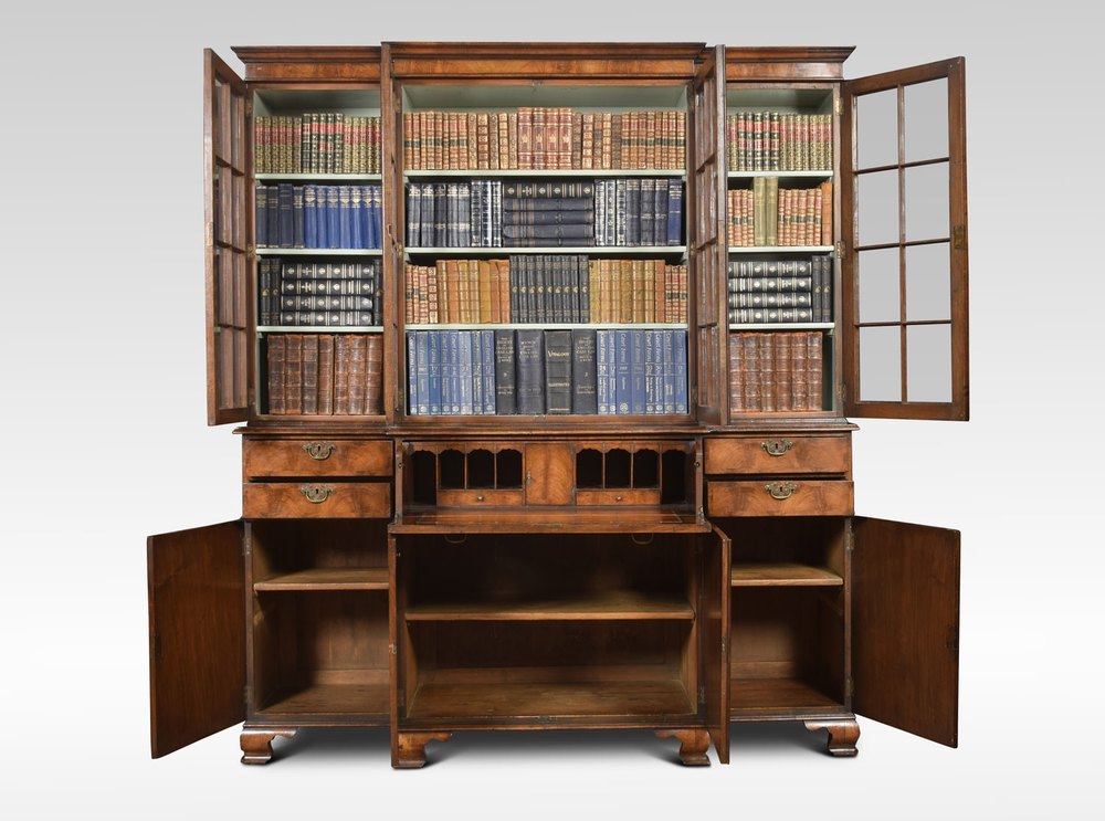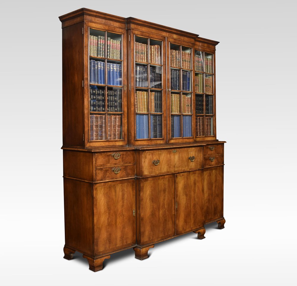 Queen Anne revival walnut four door bookcase, the projecting cornice above, four large glazed doors opening to reveal fixed shelved interior. To the base section fitted with a central secretaire drawer and original inset leather. flanked by short drawers with brass tooled handles. Above four figured walnut doors opening to reveal shelved interior all raised up on ogee bracket feet.