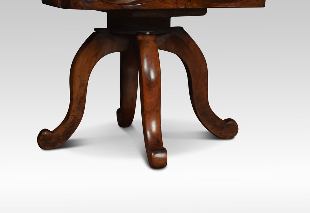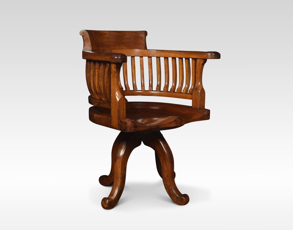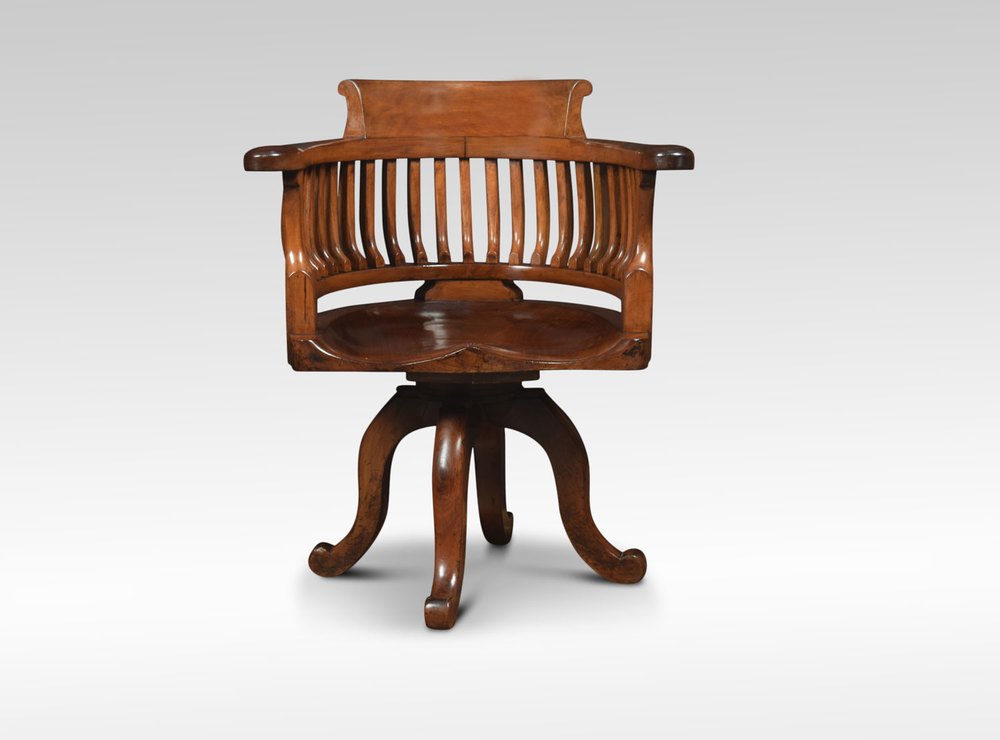 Early 20th Century walnut office / captain’s revolving desk chair with shaped back and open arms above a solid walnut seat all raised up on four cabriole legs.