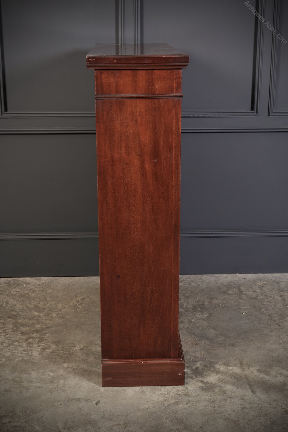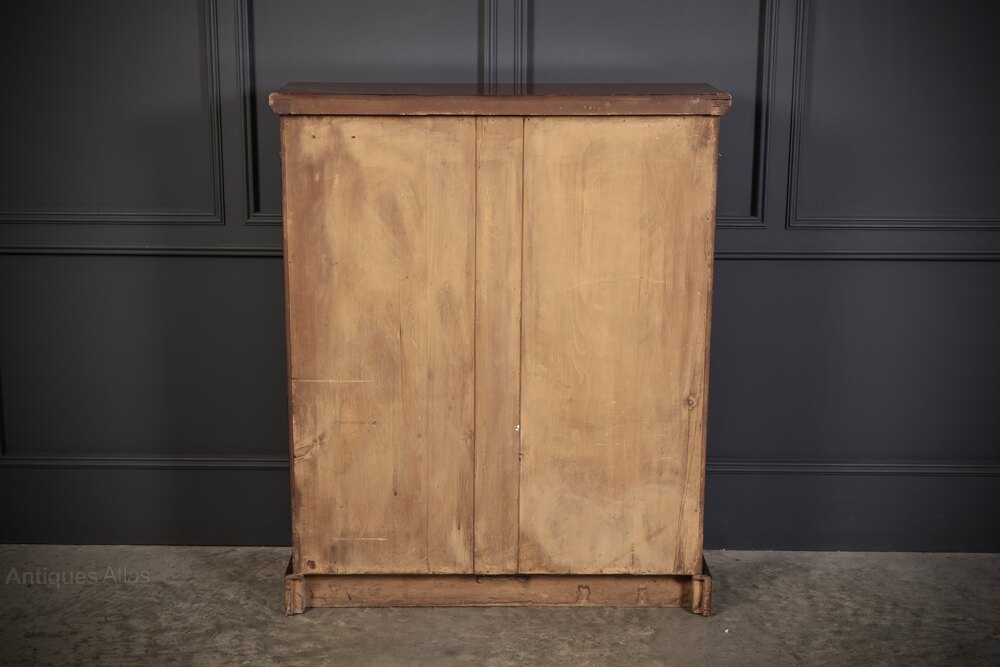 Solid walnut top above a carved frieze, holding 3 height adjustable shelves inside with fluted carving down each side leading to a plinth base.