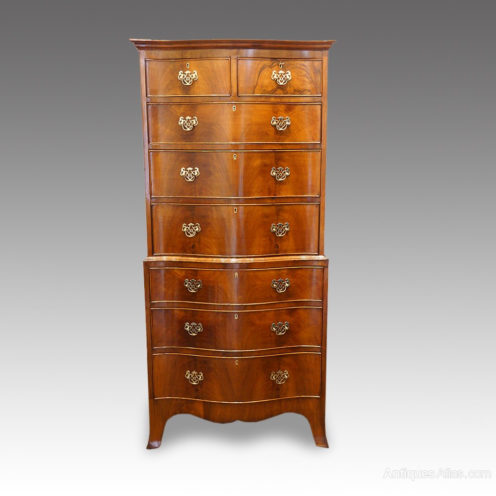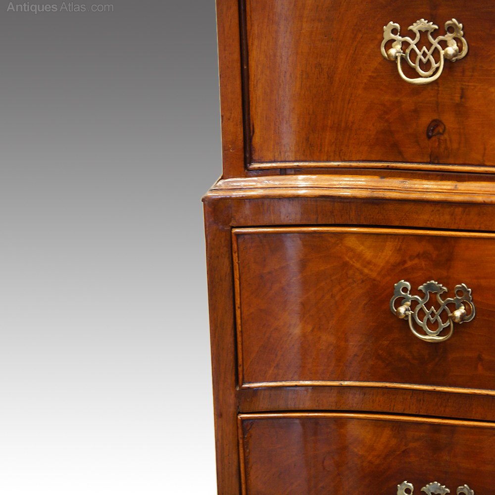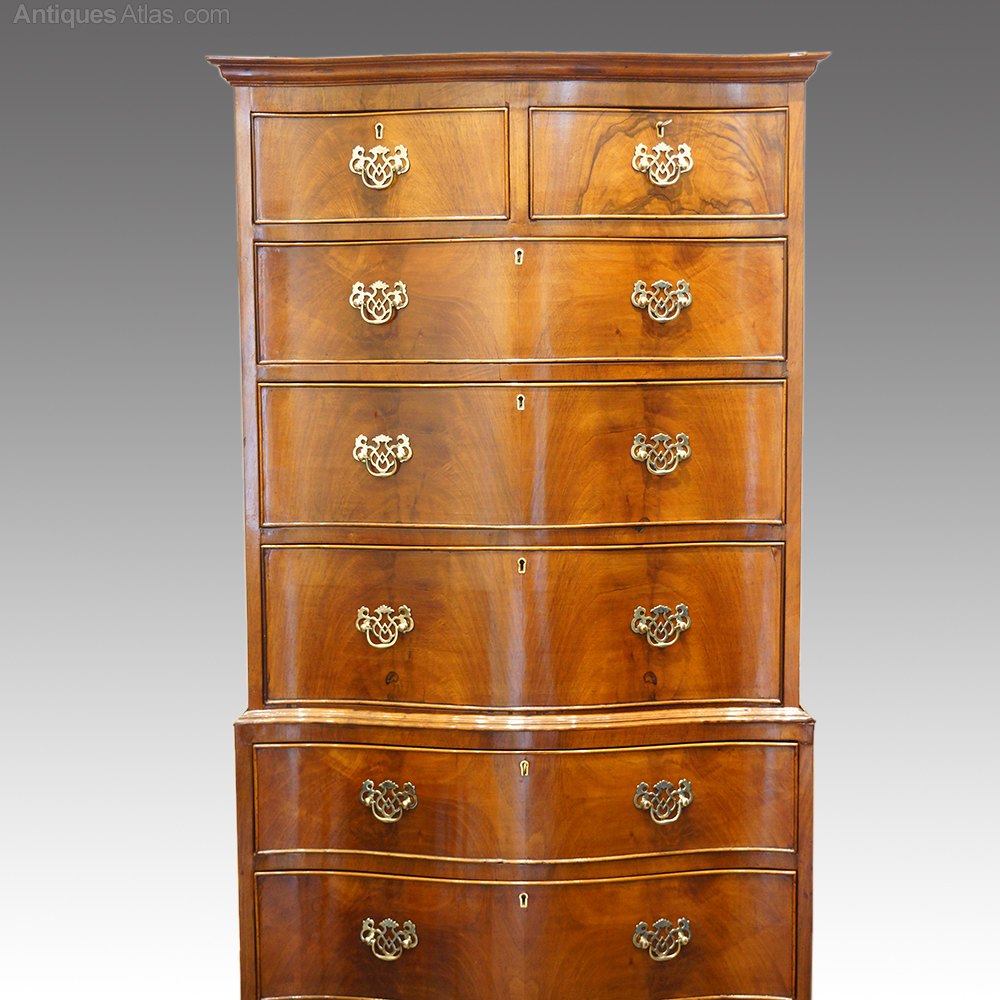 This Walnut serpentine tallboy is a piece of antique furniture that is a very green product that have not affected the environment we live in.