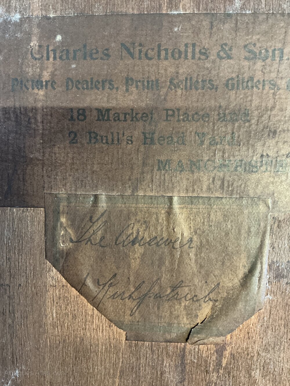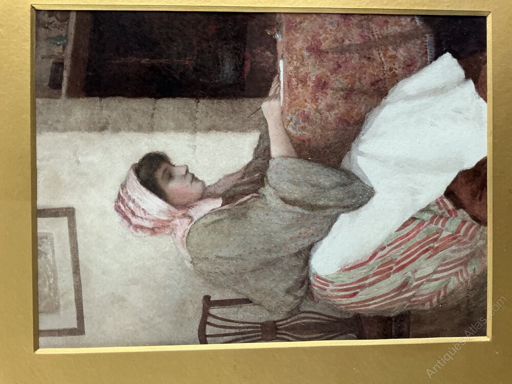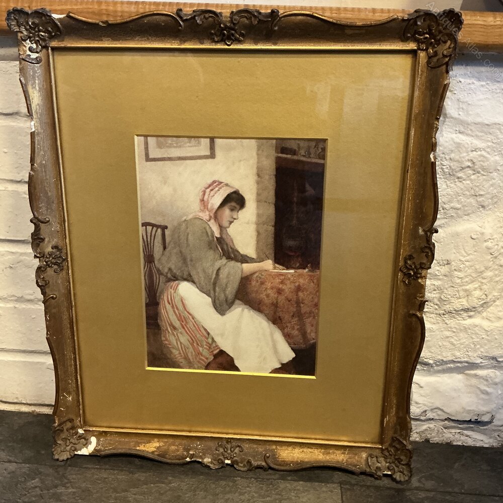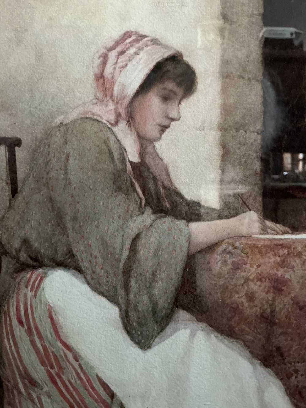 A watercolour interior scene with a young woman writing a letter . It is by Joseph Kirkpatrick ( 1872 -1930 ). It is signed and dated 1904 indistinctly on an old label on the back of the picture frame . He is better known for his rural scenes . The picture is26.5 cms x 19cms . There is a little damage to the frame (see photo) . I personally prefer it left alone .