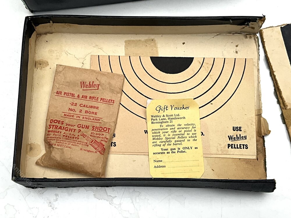 Pistol comes in good shape and fully working not the most rare paper bag of original Webley pellets that’s never been opened, early numbers box has side needing sticking back otherwise good, offering free delivery UK reference DBSS Tel: 07505 165 843 International Tel: +44 7505 165 843 We accept online payments for all our items listed: Bank transfer cash on collection personal cheques or if wishing over the phone using your debit or credit cards, also doing layby payments plan, or email giving your address details & contact number and we shall send you your items invoice to make payment with your card. Send your request to - john.strong2@gmail.com