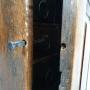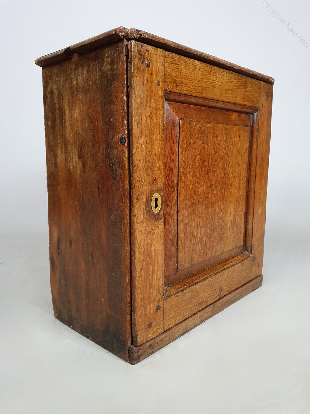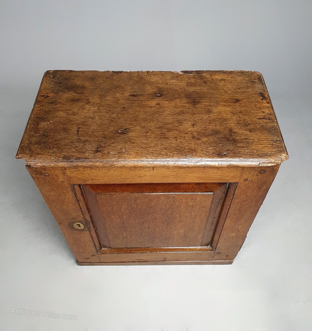 The oak has developed a lovely warm honey colour and very good patination. The shaped and fielded panel door once had an inset lock but this has been covered and replaced with a blacksmith forged nail which slots into the side case and holds the door shut – a rather charming functional adaptation.