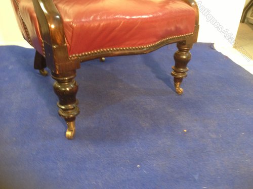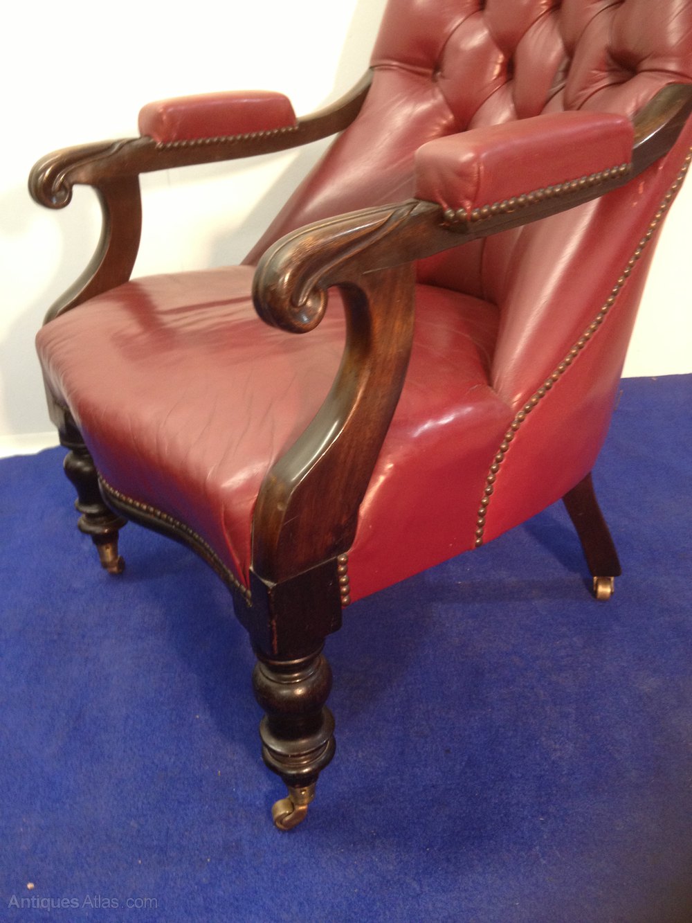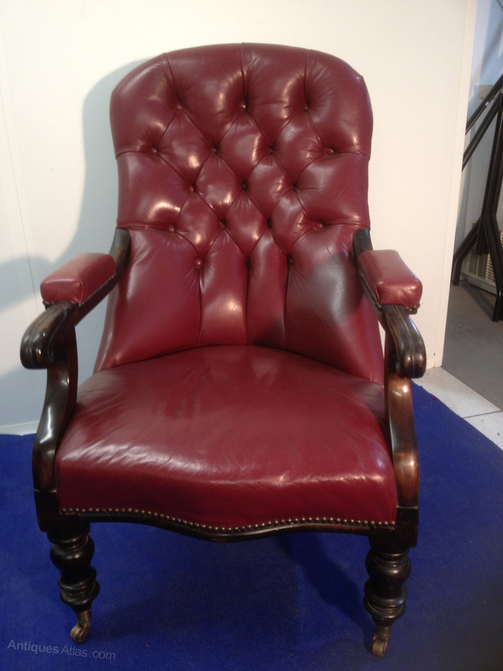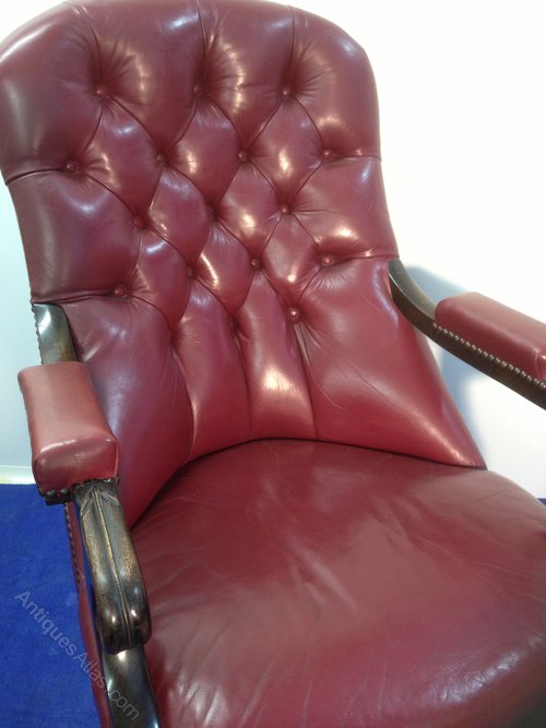 A good mahogany library chair upholstered in ed leather, in very good condition with no damage to the leather, and extremely comfortable.