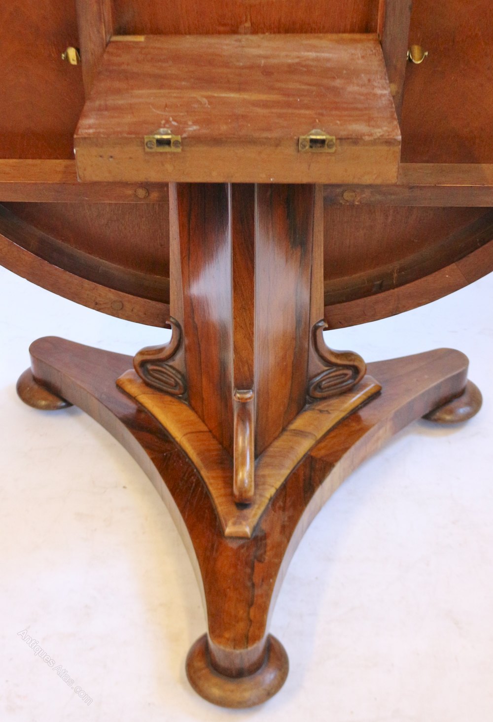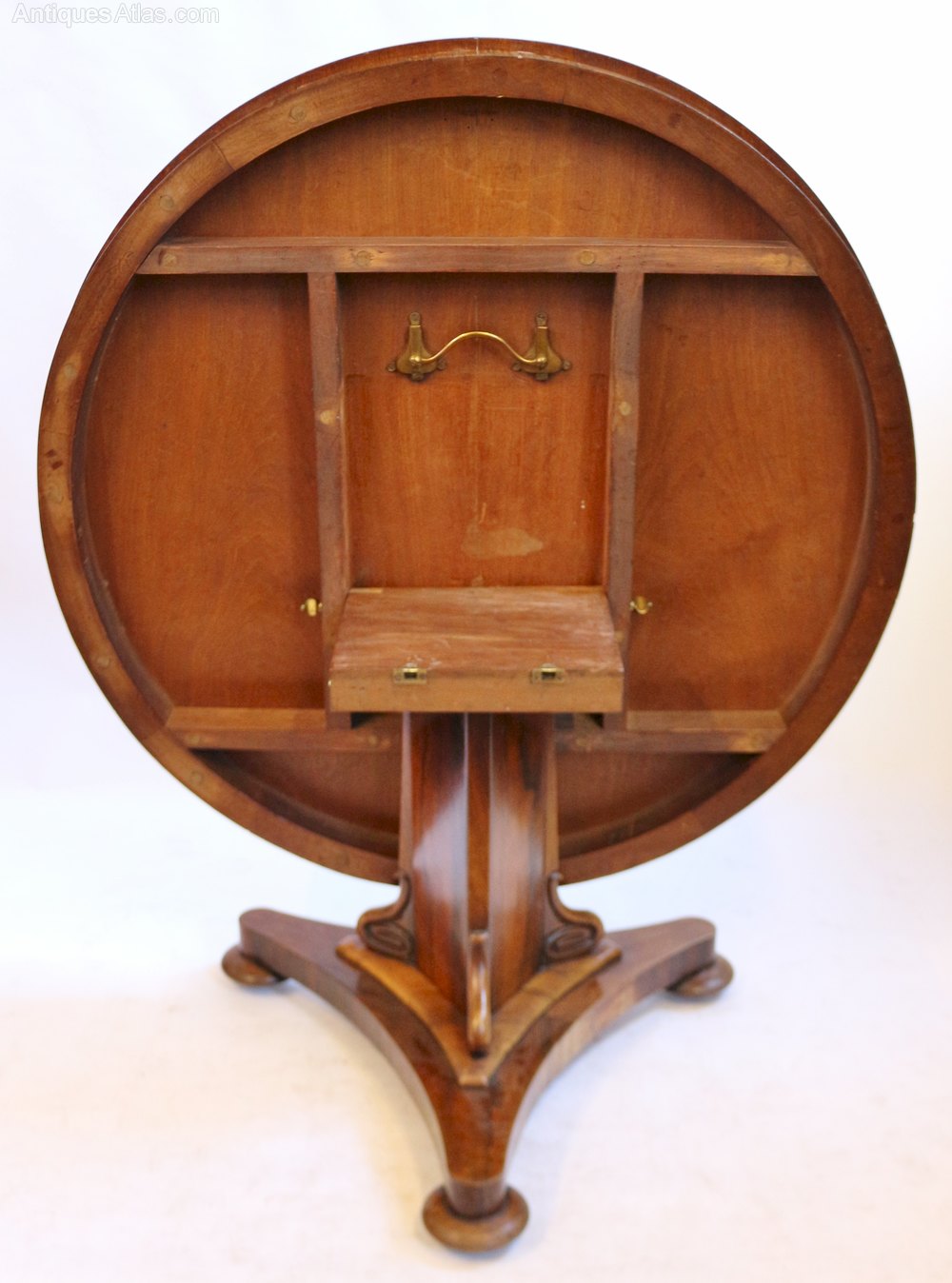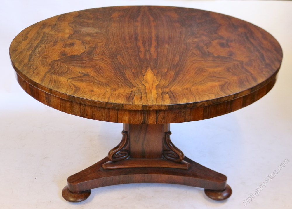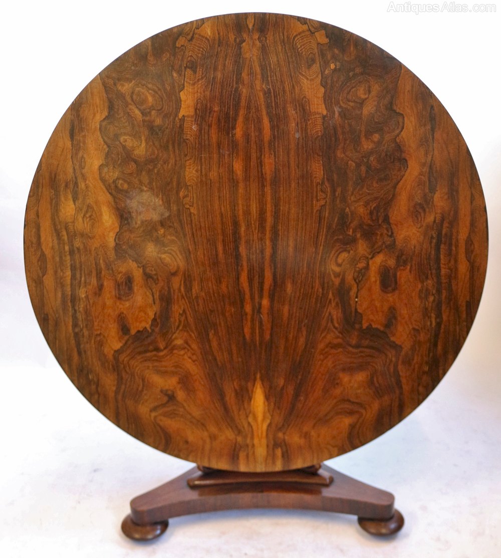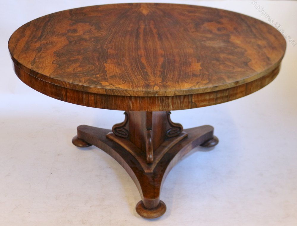 William IV Figured Rosewood Round Pedestal Centre Table. The well figured top having square edge with an apron below. The top tils on a mahogany block and is held by brass bolts and clip. On 3 sided pilaar with corner scrolled brackets with rounded collar to base. Sitting on triform platform base with bun feet and hidden castors.
