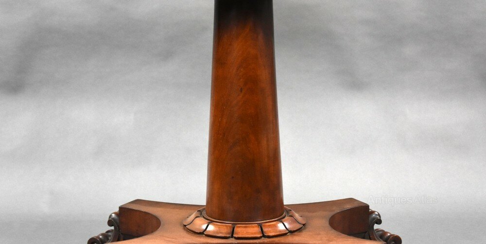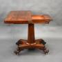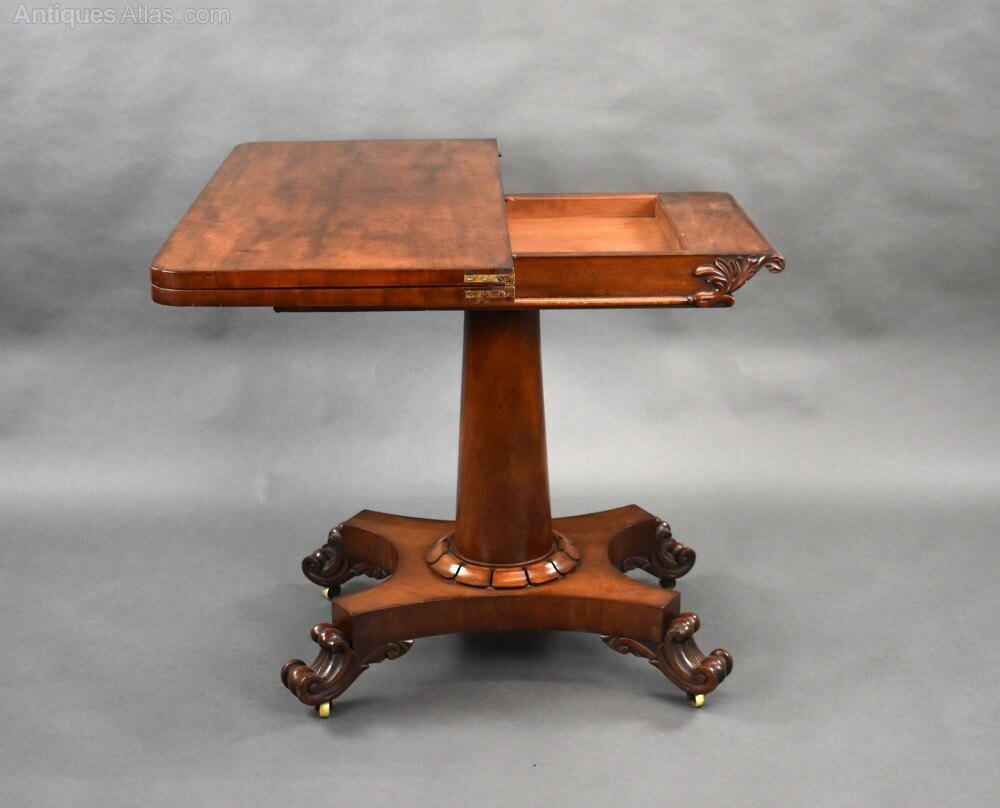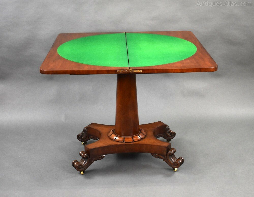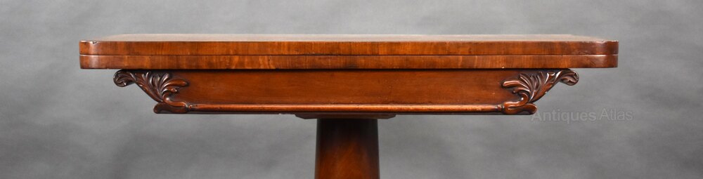 A fine William IV mahogany card table of elegant proportions and superb colour. The rectangular top with rounded front corners swivels and folds open to reveal a baize-lined playing surface, supported by a central baluster column. Decorative carved scroll brackets sit beneath the frieze, and the platform base is raised on bold scrolled feet with concealed castors.