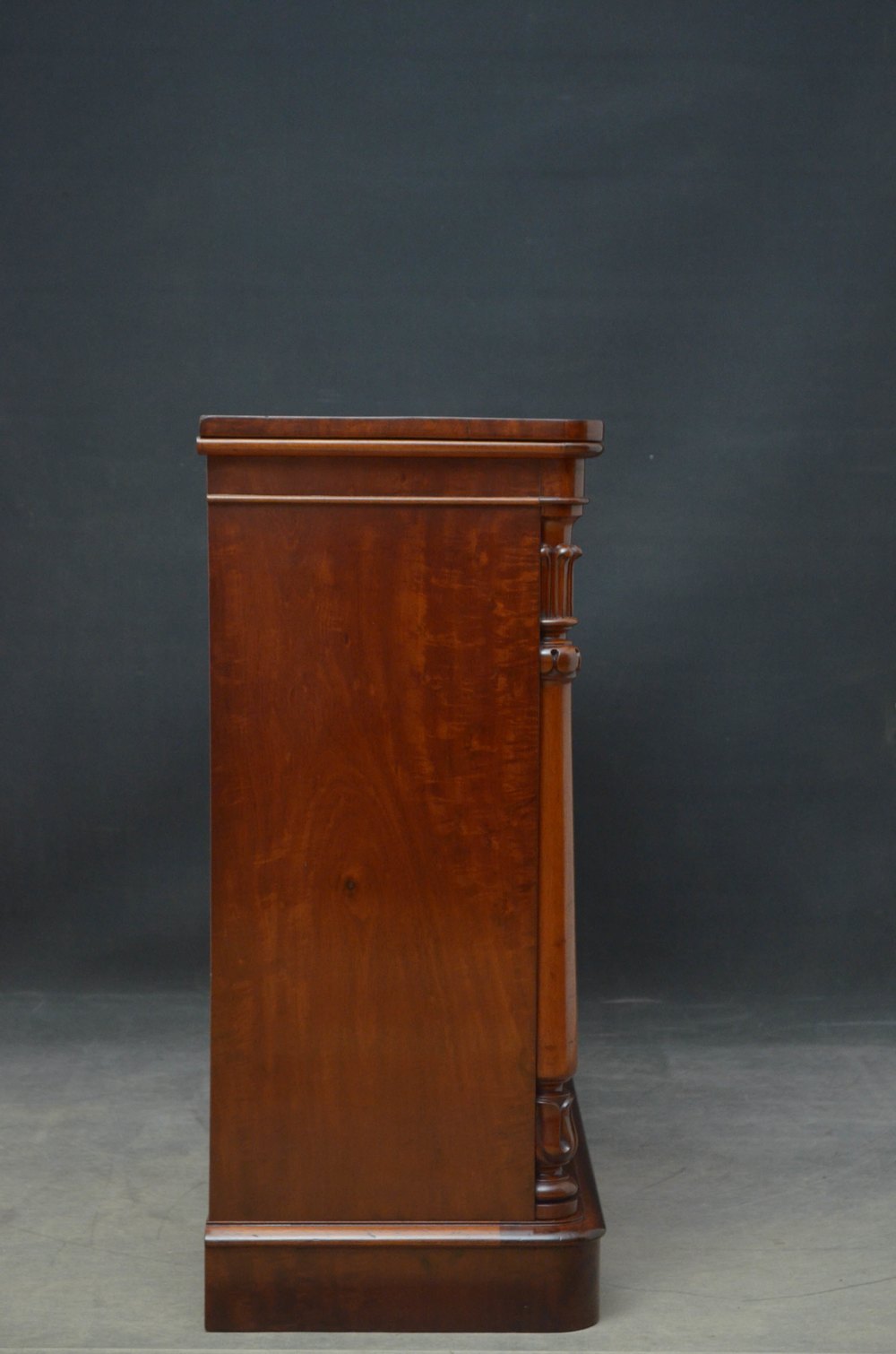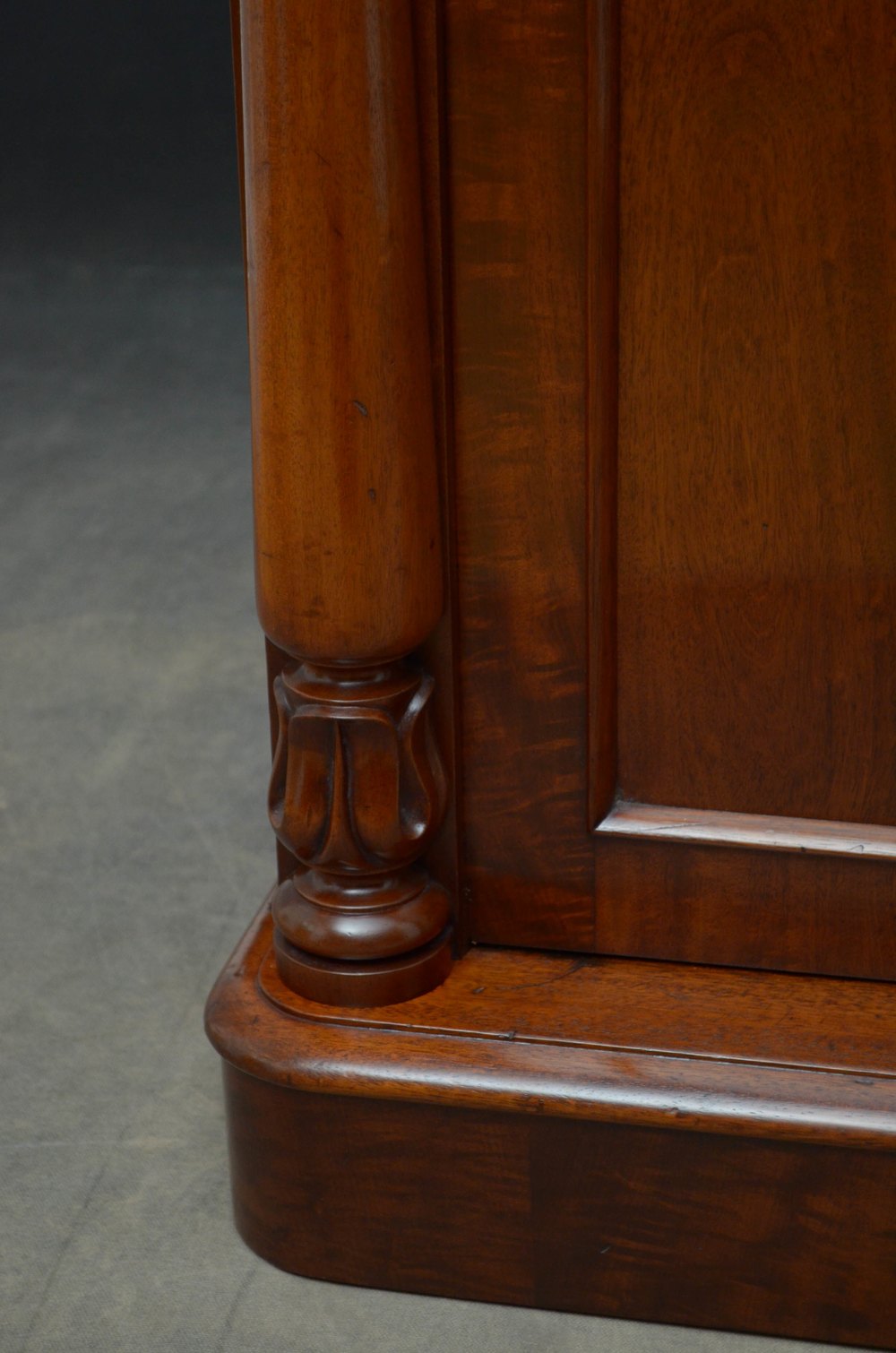 J00 Fine quality William IV two door sideboard in mahogany, having figured top above a pair of figured mahogany panelled doors enclosing removable shelf and fitted with working lock and a key, all flanked by columns with tulip carved capitals, all standing on plinth base. This antique sideboard has been sympathetically restored and is ready to place at home. c1835