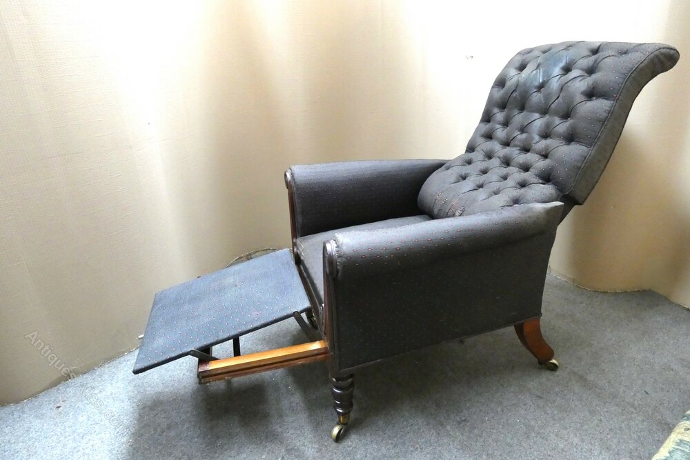 Good quality mahogany reading / library chair by George Minter of Gerard Street Soho, the deep buttoned back with reclining mechanism and pull out padded foot rest, raised on turned legs, one stamped with Minter, Gerard Street Soho, Patent 855 and fitted with brass caps and castors stamped Copes Patent.