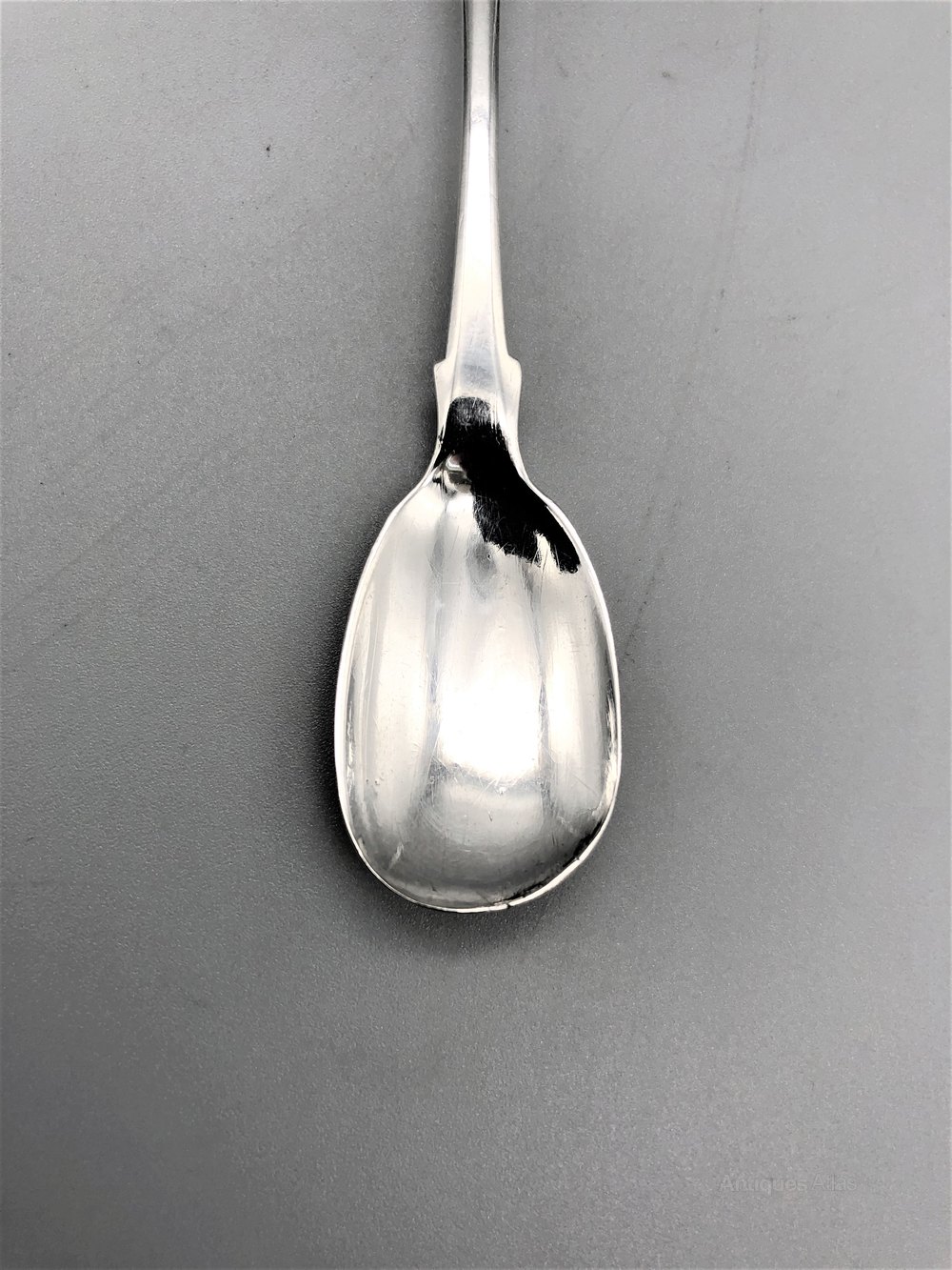 The mustard spoon was made by William Woodman of Bristol and assayed in Exeter in 1832. William Woodman was active in Bristol between 1818 and 1838. After his death, the company was continued by Robert Williams and would eventually become Josiah Williams & Co. Because Bristol didn't have its own assay office, William Woodman sent his pieces to Exeter, the principal office for South West England, to be marked.