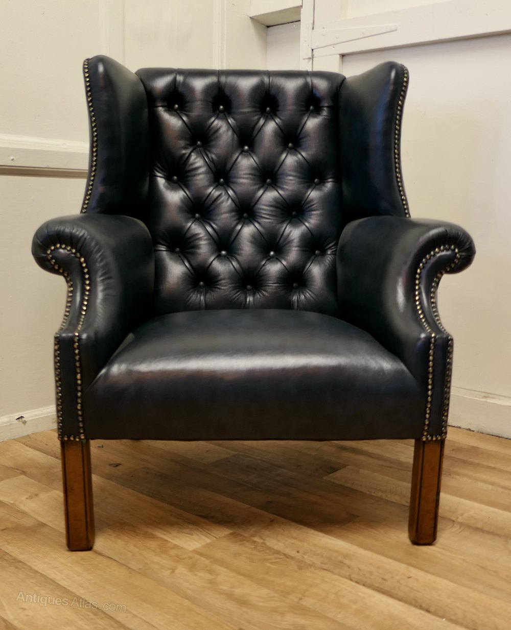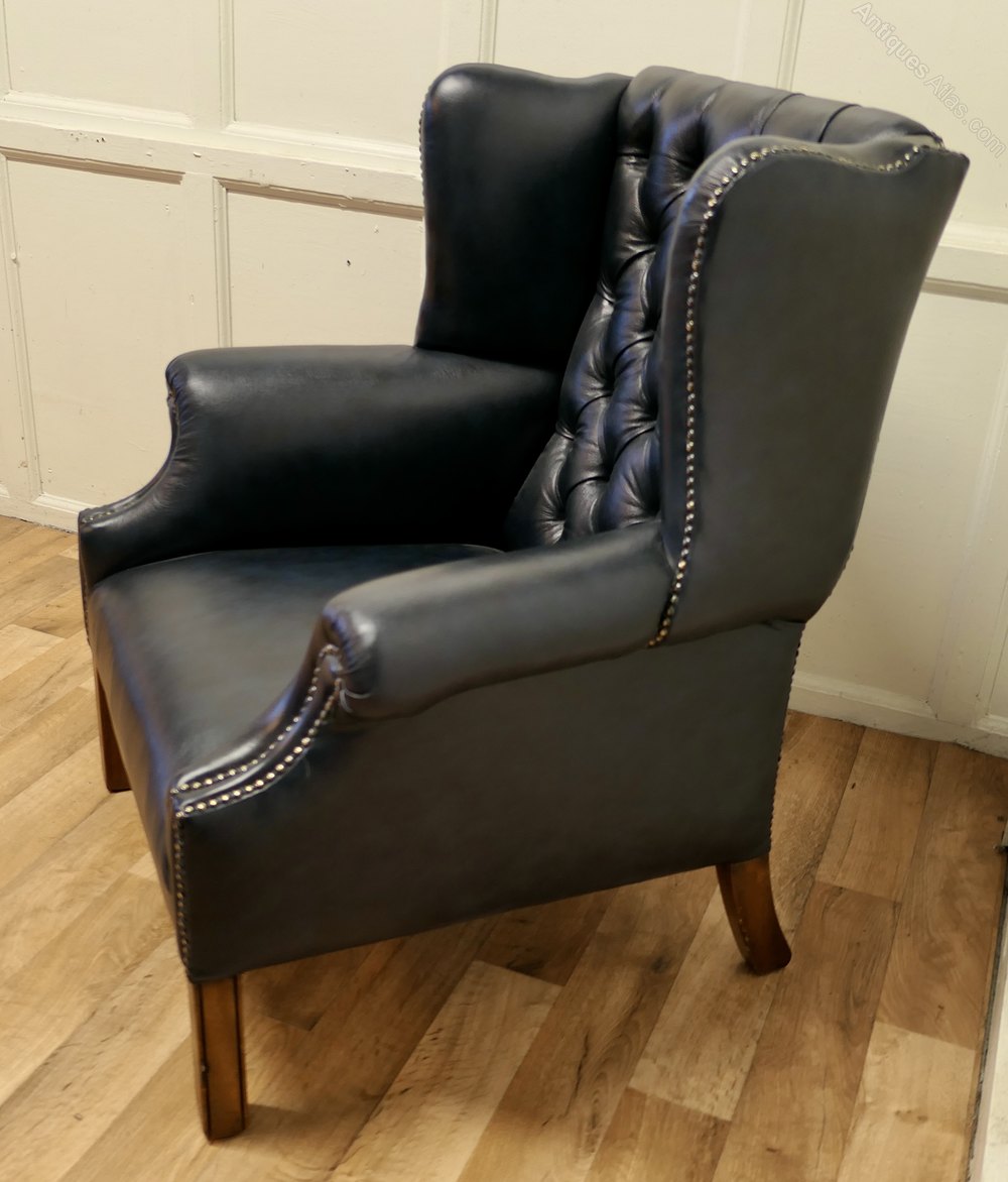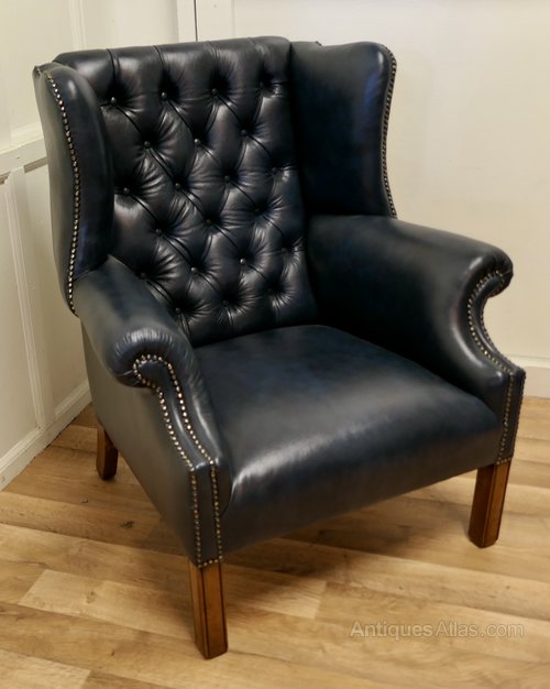 This is a very roomy chair, the ultimate in Vintage Country House Chic, the leather upholstery is new, it has been upholstered with superb soft quality hide in Antique Blue