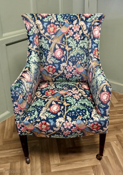 The chair has a high wing back with arm rests and it is set on small legs with brass casters