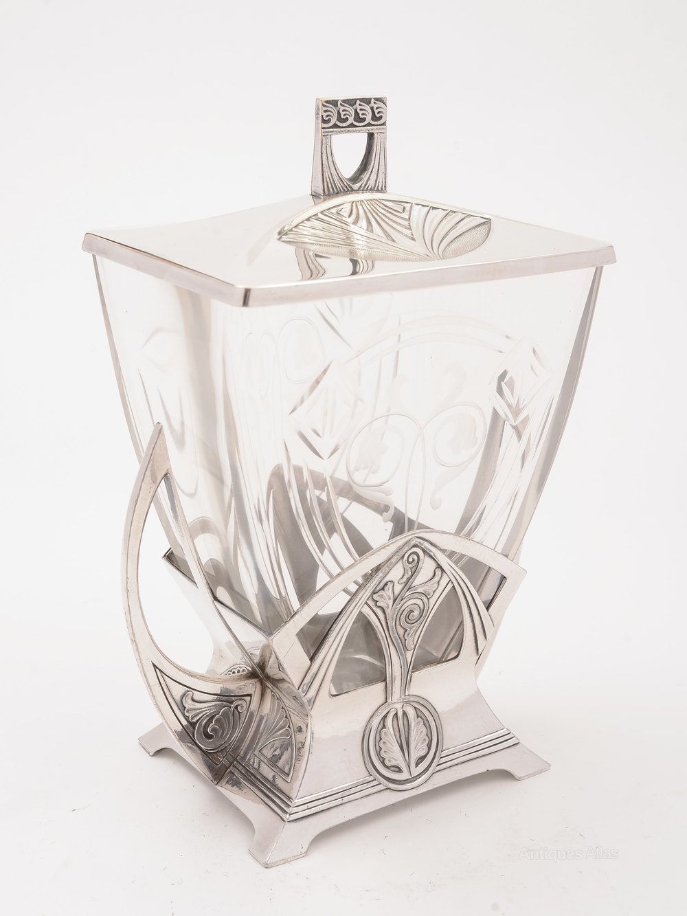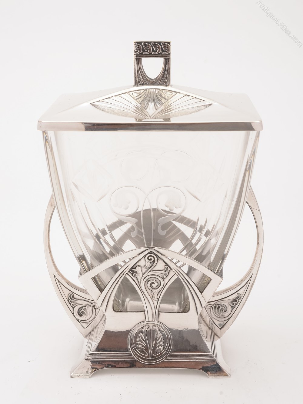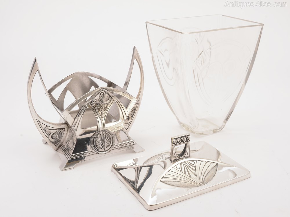 A beautiful German WMF Secessionist pewter biscuit box with stylised silver plated pewter base and shaped cut glass liner with plated stylised lid. Circa 1900.